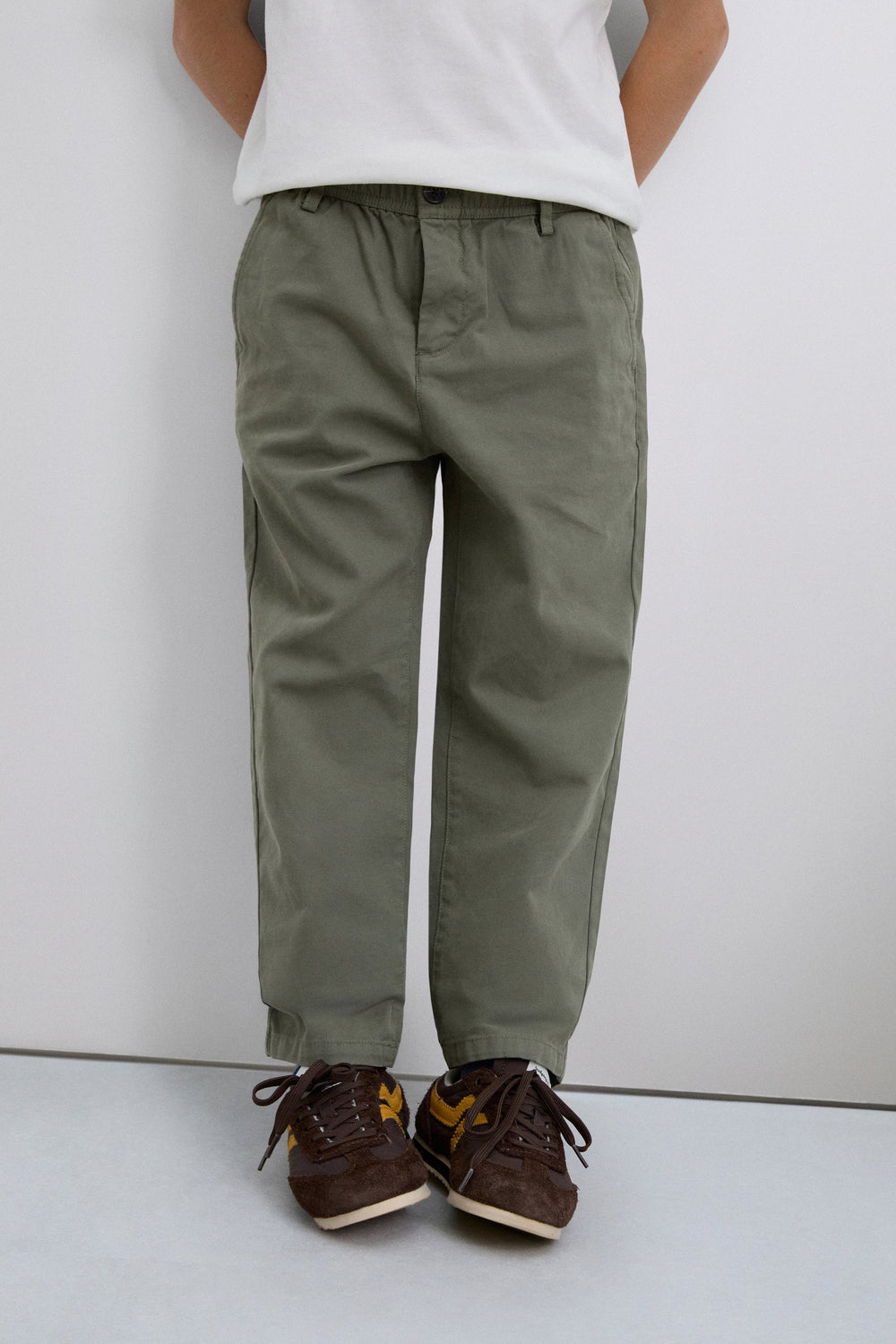 Chino trousers made of 100% BCI cotton. Two front and back pockets. Button fastening and belt loops. Logo label detail on the pocket.