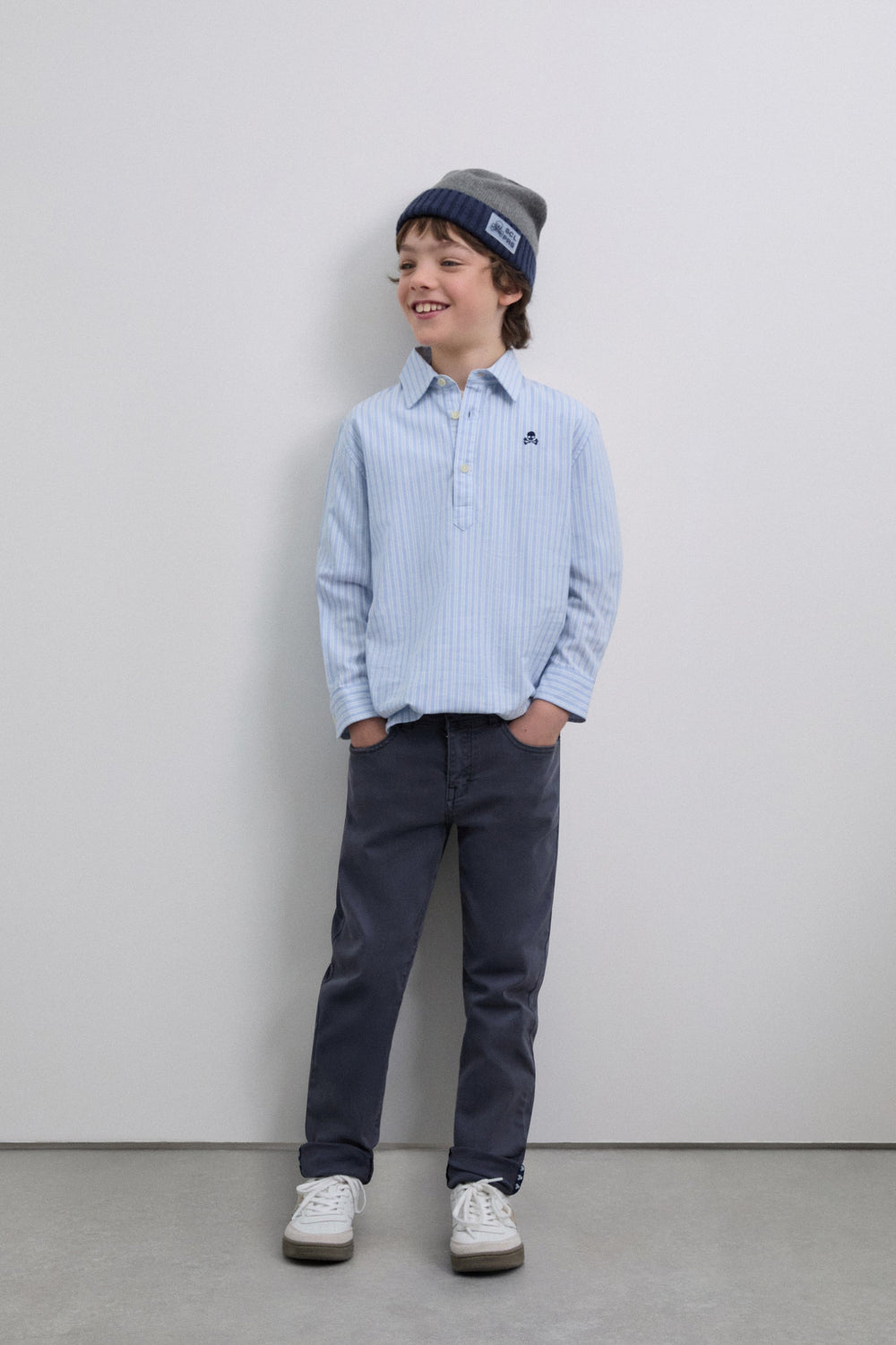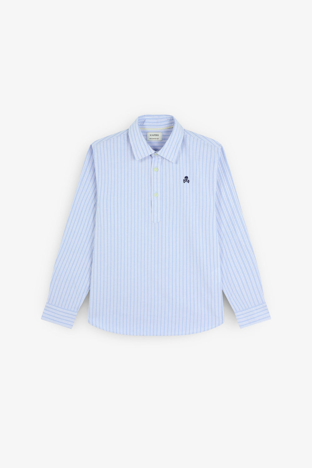 Striped polo shirt made of 100% BCI cotton. Classic collar, button fastening, regular fit, contrast skull on chest. Buttoned cuffs.