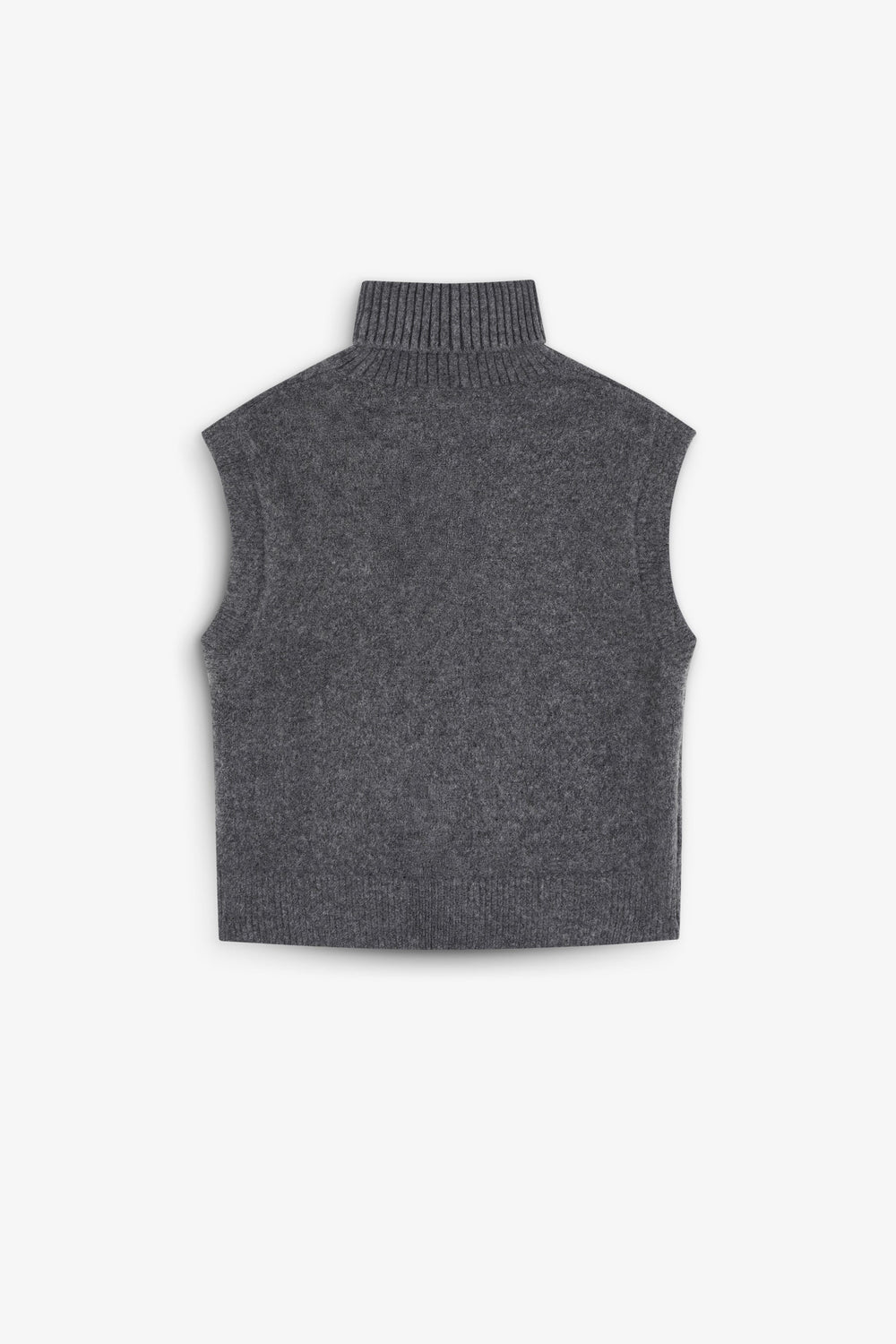 Knit vest. Roll neck. Ribbed trim. Metal skull tag detail.