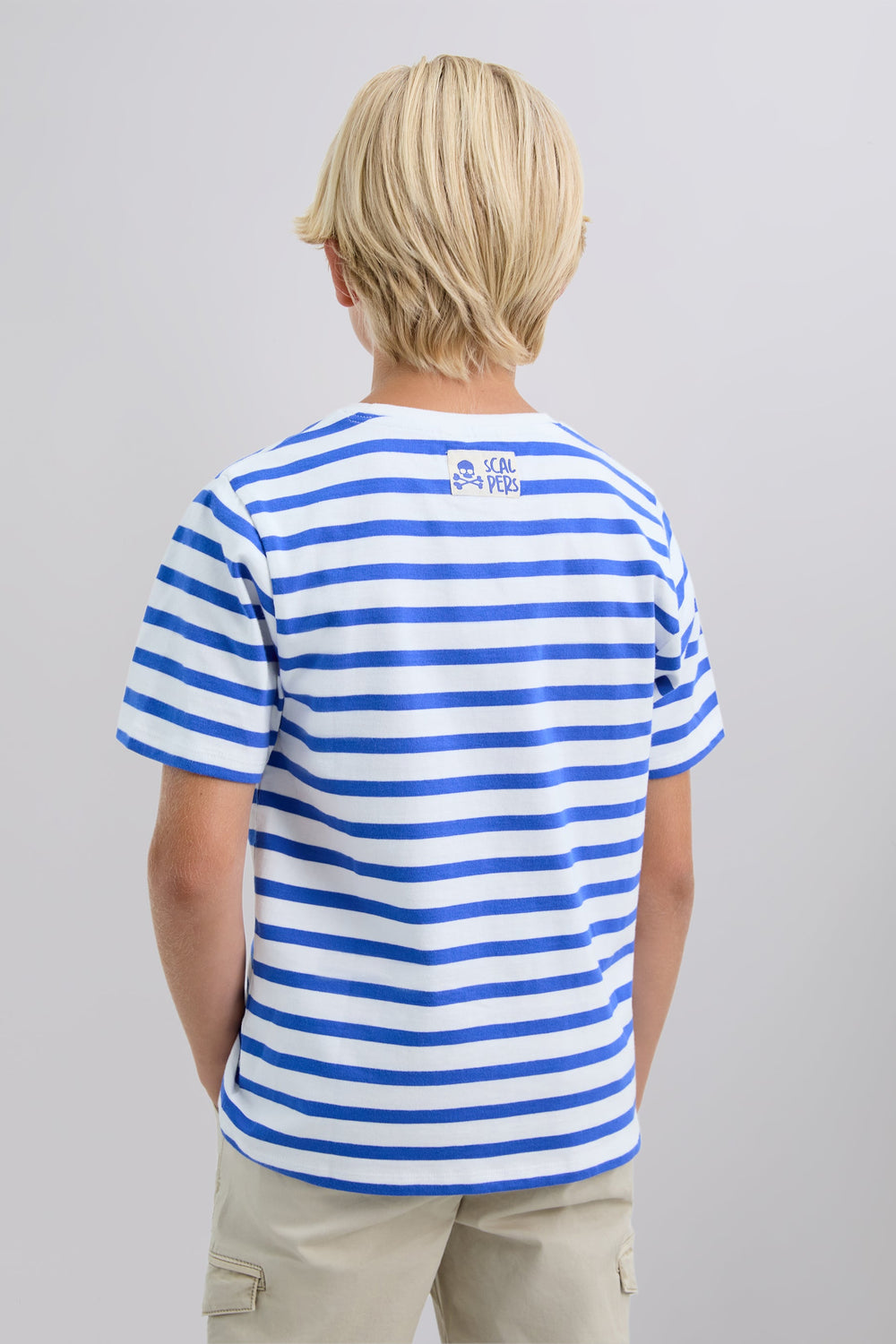 T-shirt made of 100% BCI cotton. Stripe print. Short sleeve. Regular fit. Contrasting collar. Embroidered patch with logo and skull on the back.