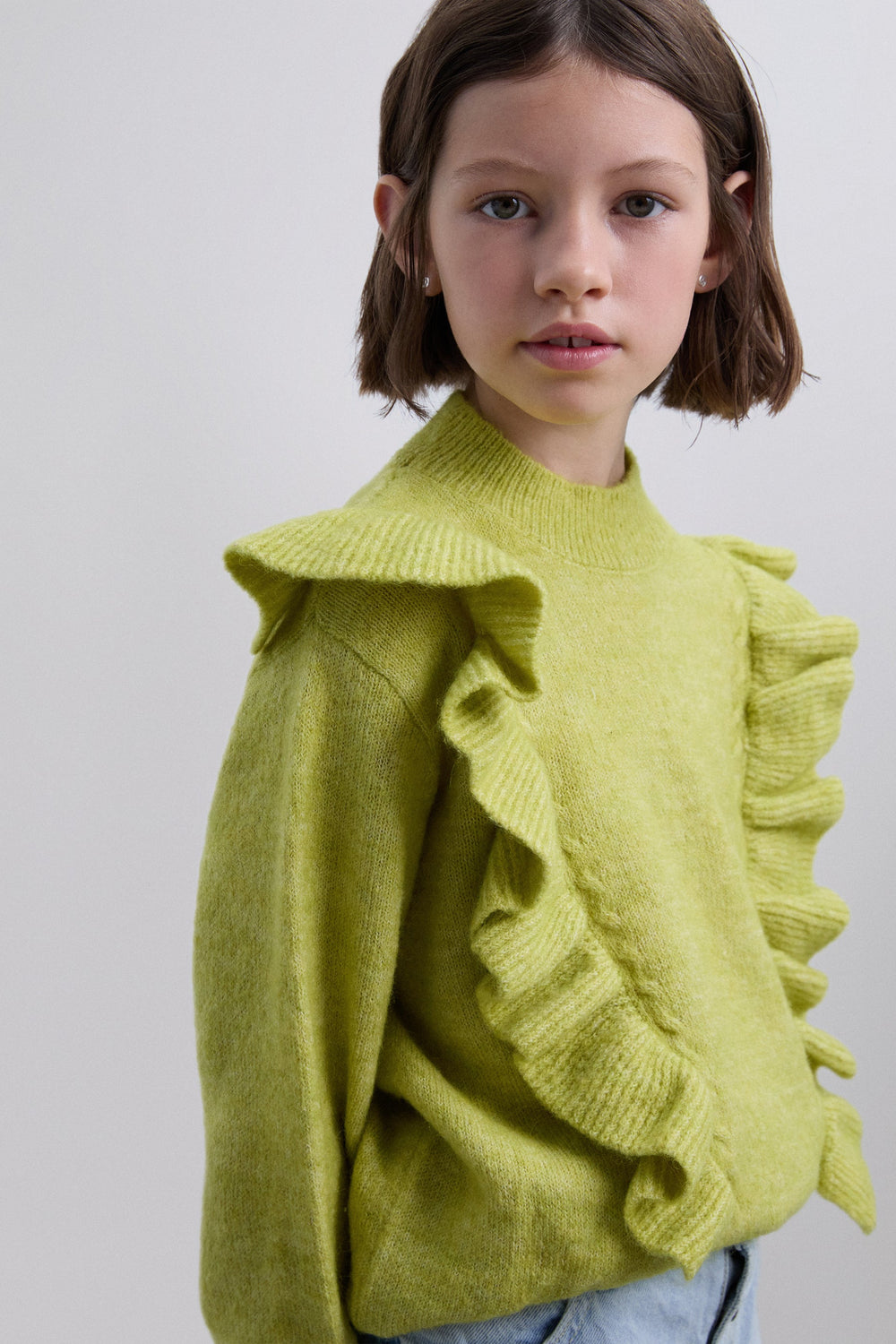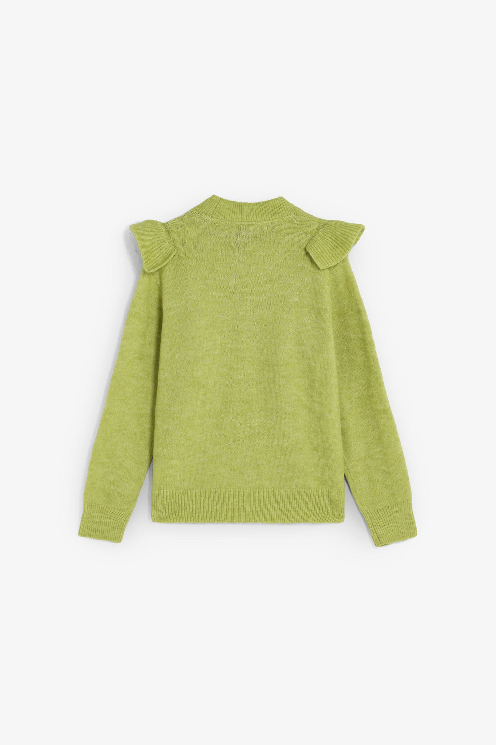 Sweater made of a synthetic blend. Long sleeves. Regular fit. Slightly high collar and ribbed cuffs. Front ruffle details.