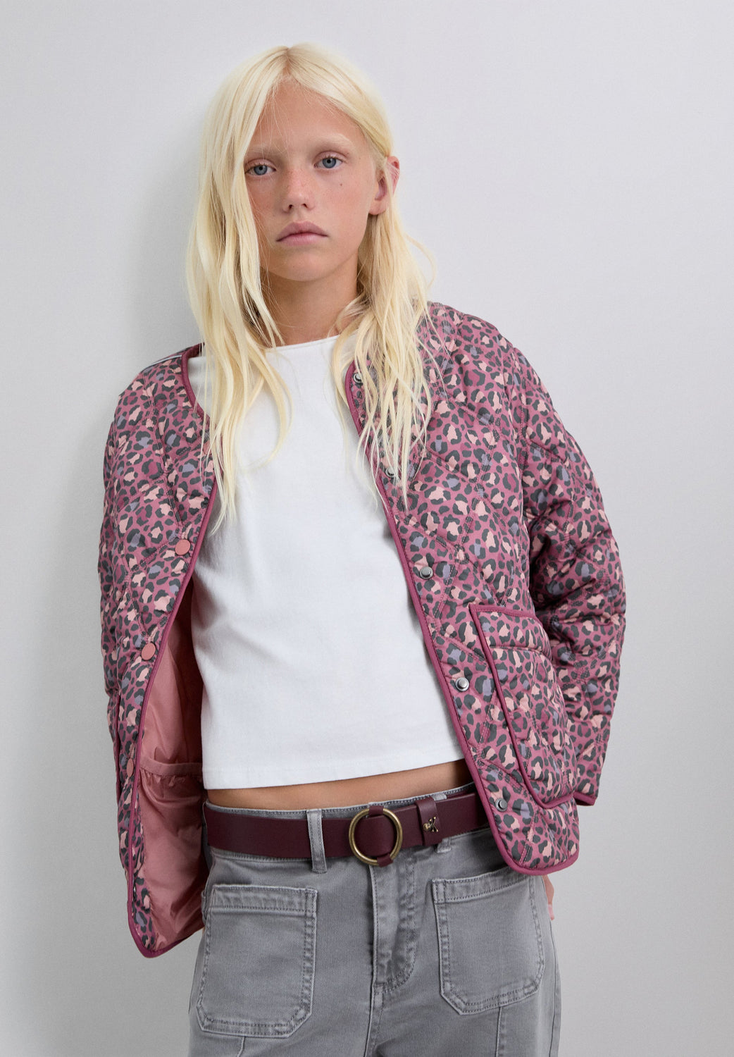 Puffer jacket made of a synthetic blend. Animal print. Button fastening. Slightly V-neck. Long sleeves. Two front pockets.