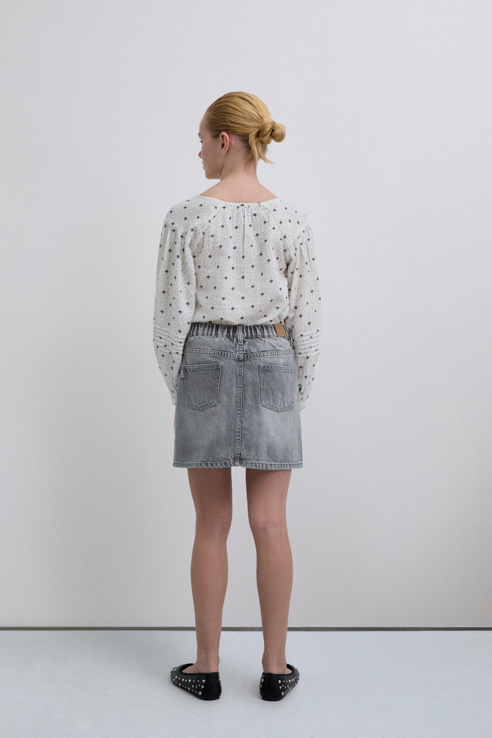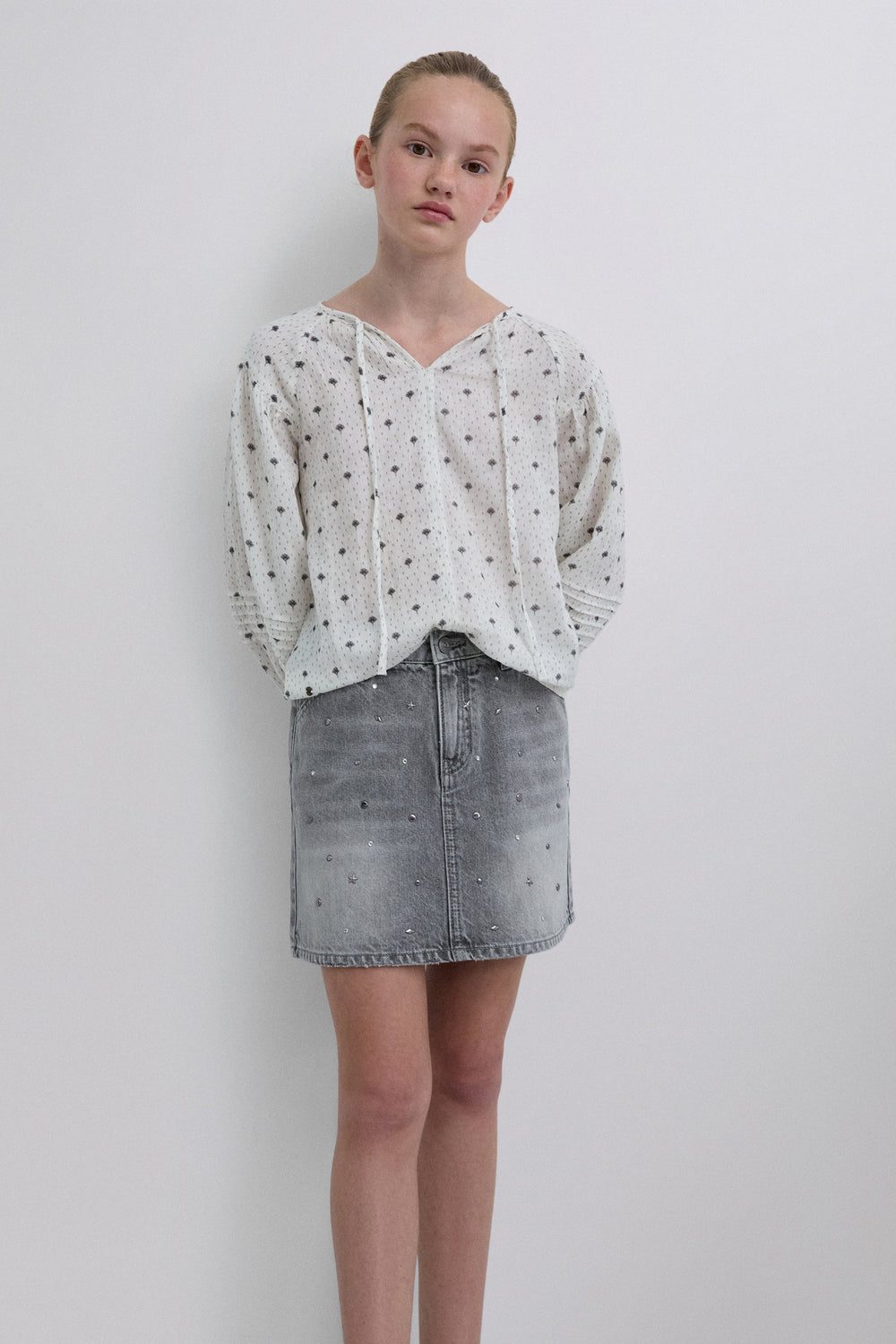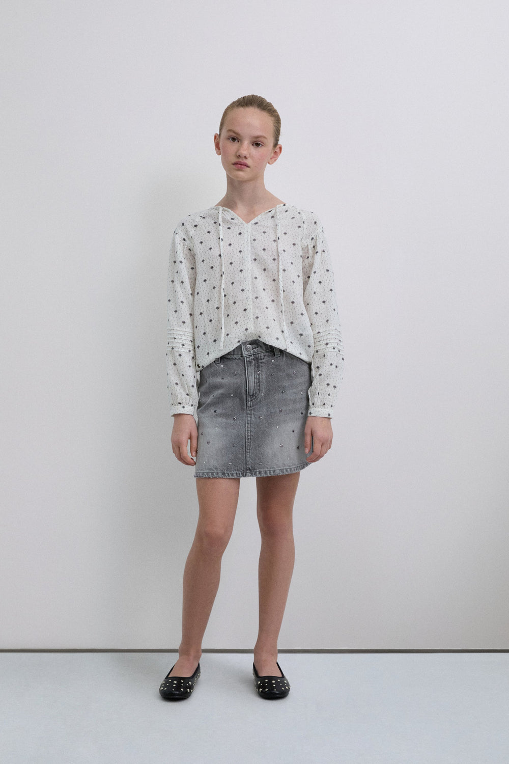 Denim mini skirt made of 100% BCI cotton. Stud detail. Button and zip fastening. Belt loops at the waist. Two front pockets and back pockets.