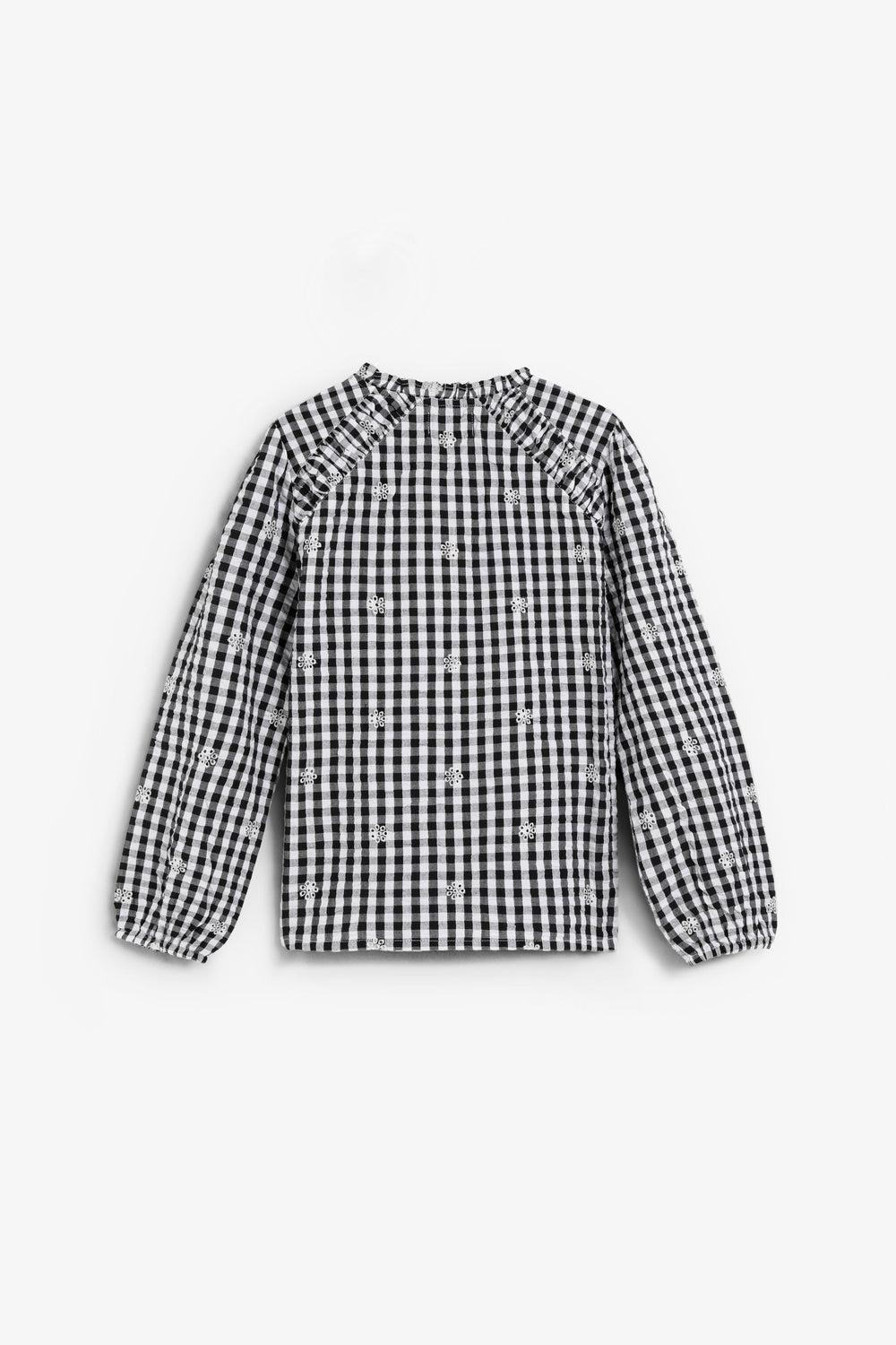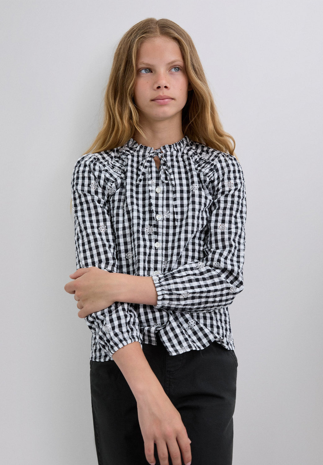 Shirt made of 100% BCI cotton. Long sleeves. Adjustable front tie and button fastening. Embroidered details.