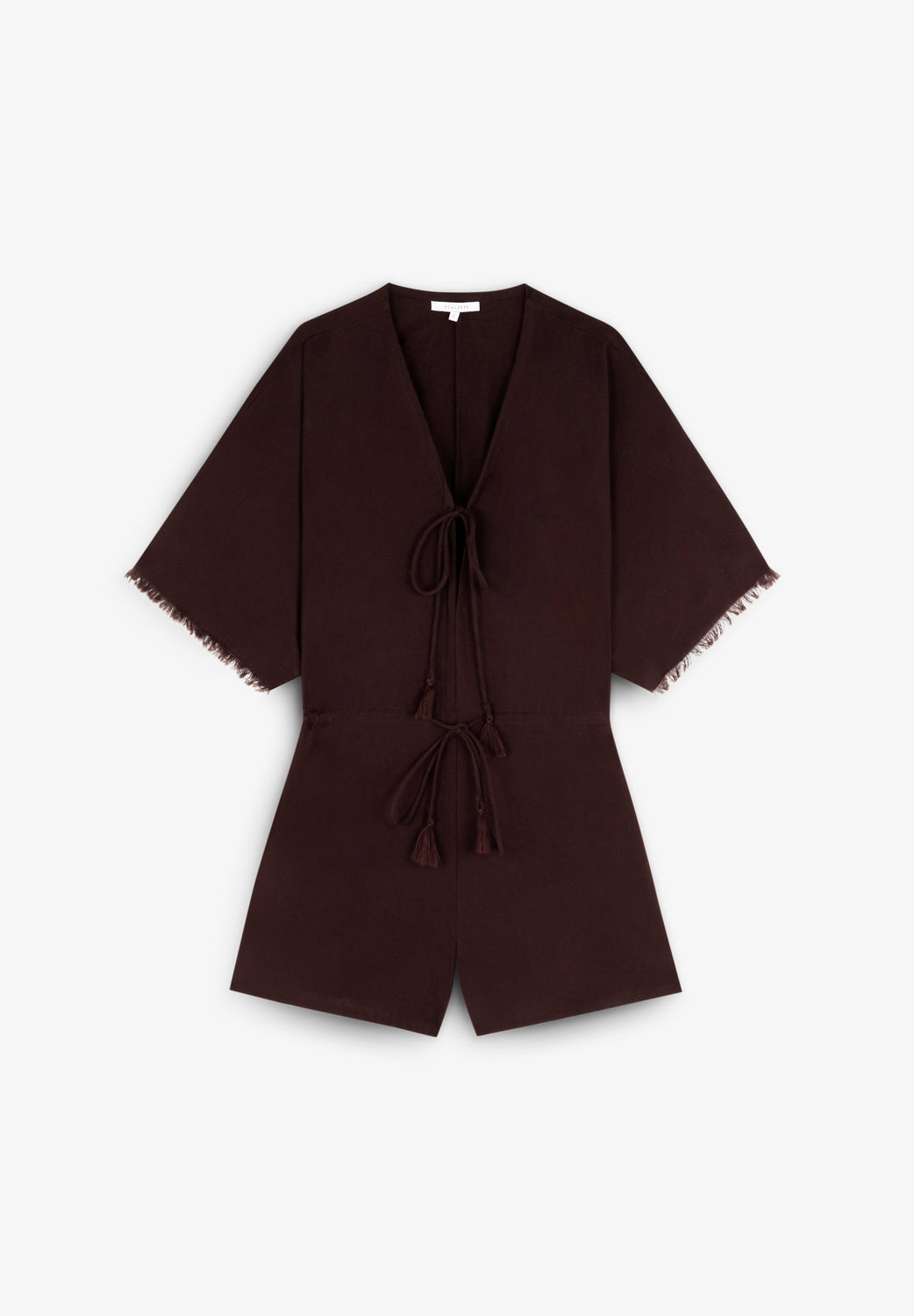 Brown jumpsuit. V-neck with bow detail. Short sleeves with fringed detail. Cotton and linen blend.