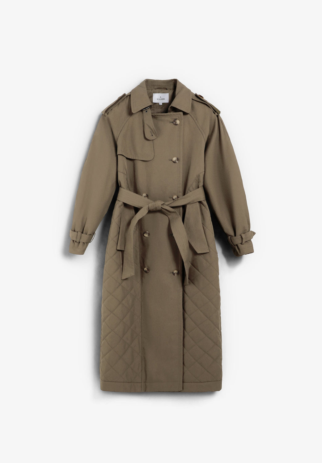 Coat quilted, waterproof trench coat made of cotton. Quilted detail at the bottom. Voluminous sleeves and cuff tabs. Front button fastening and adjustable belt.