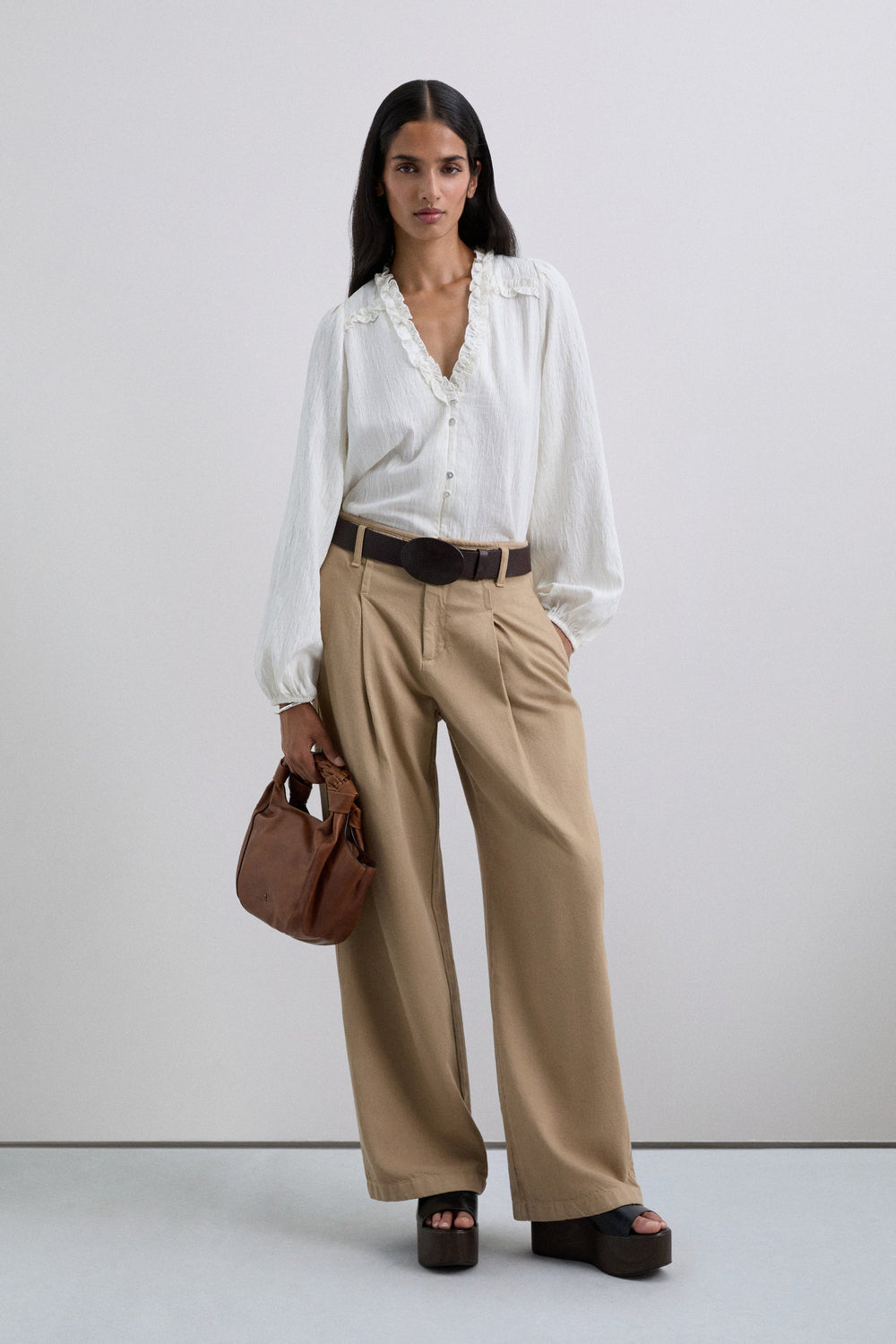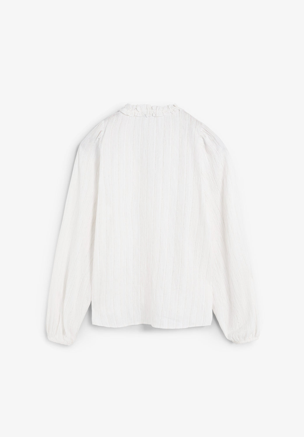 Blouse made of flowing fabric with metallic yarn detailing. Regular fit, V-neckline with gathered details on neck and shoulders. Long puff sleeves with cuffs. Front button fastening.