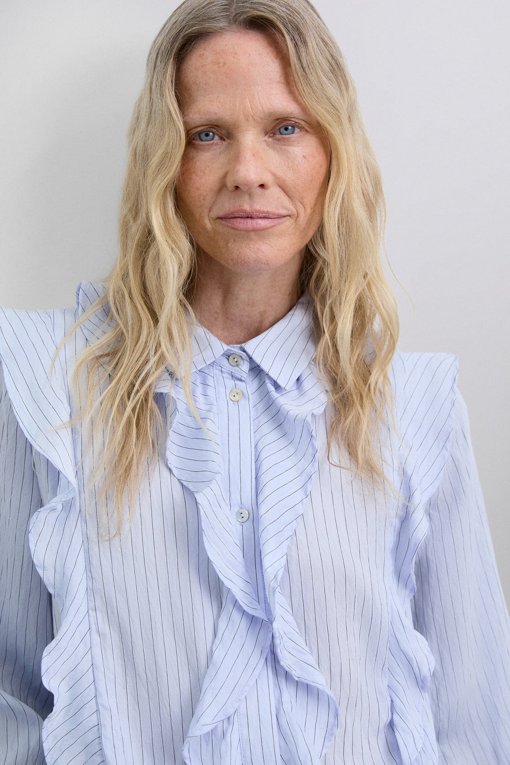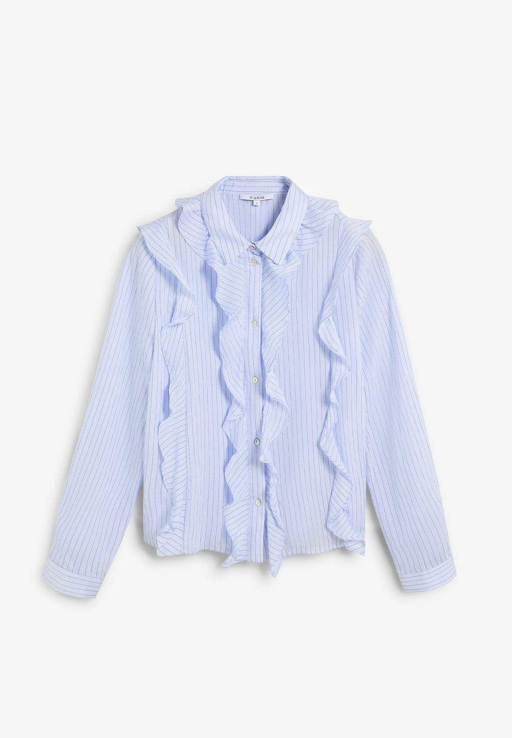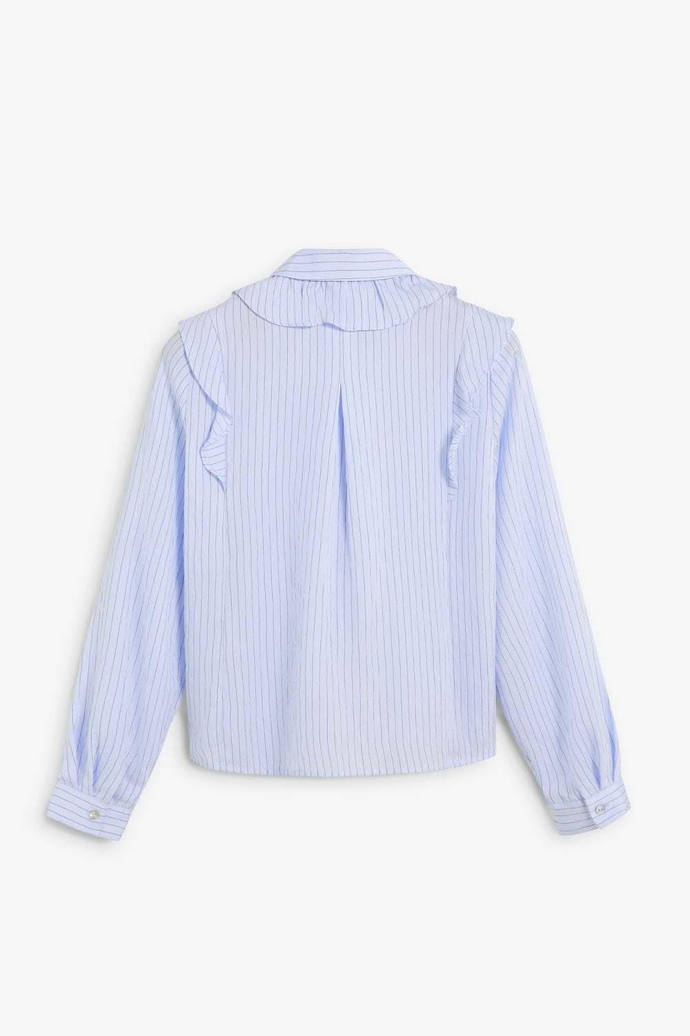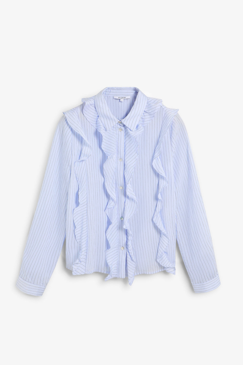 Shirt made of a viscose blend. Striped print with ruffles. Classic collar and long sleeves with buttoned cuffs. Button fastening. Ruffle details.