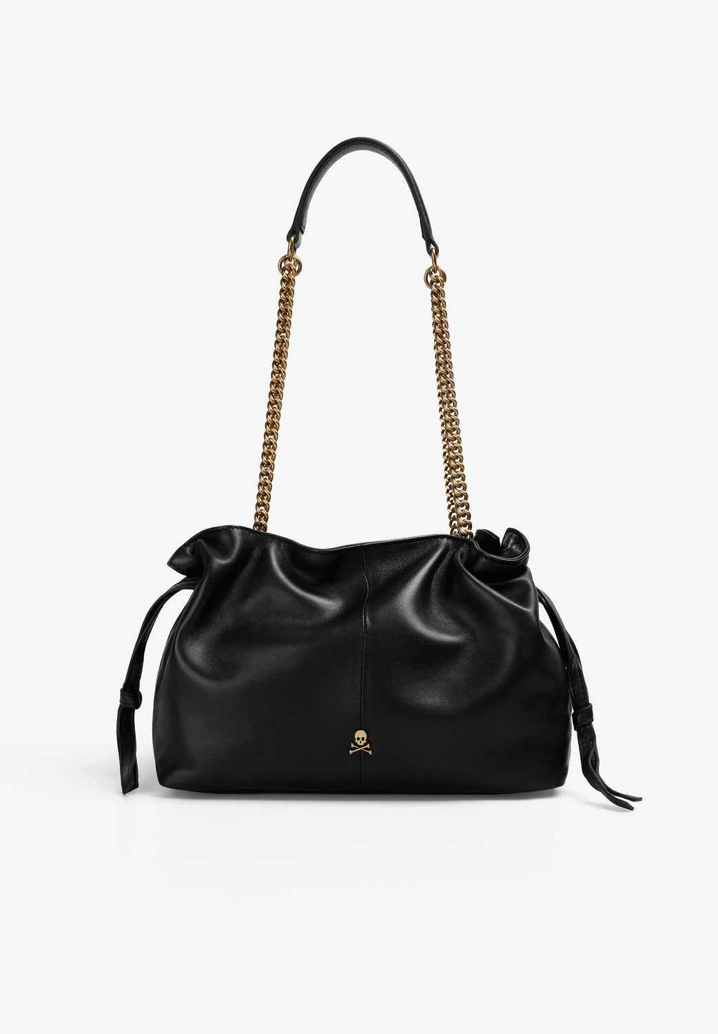 Bag made of 100% leather. Inner compartment. Shoulder chain. Button closure. Side adjusters. Front metal skull detail.