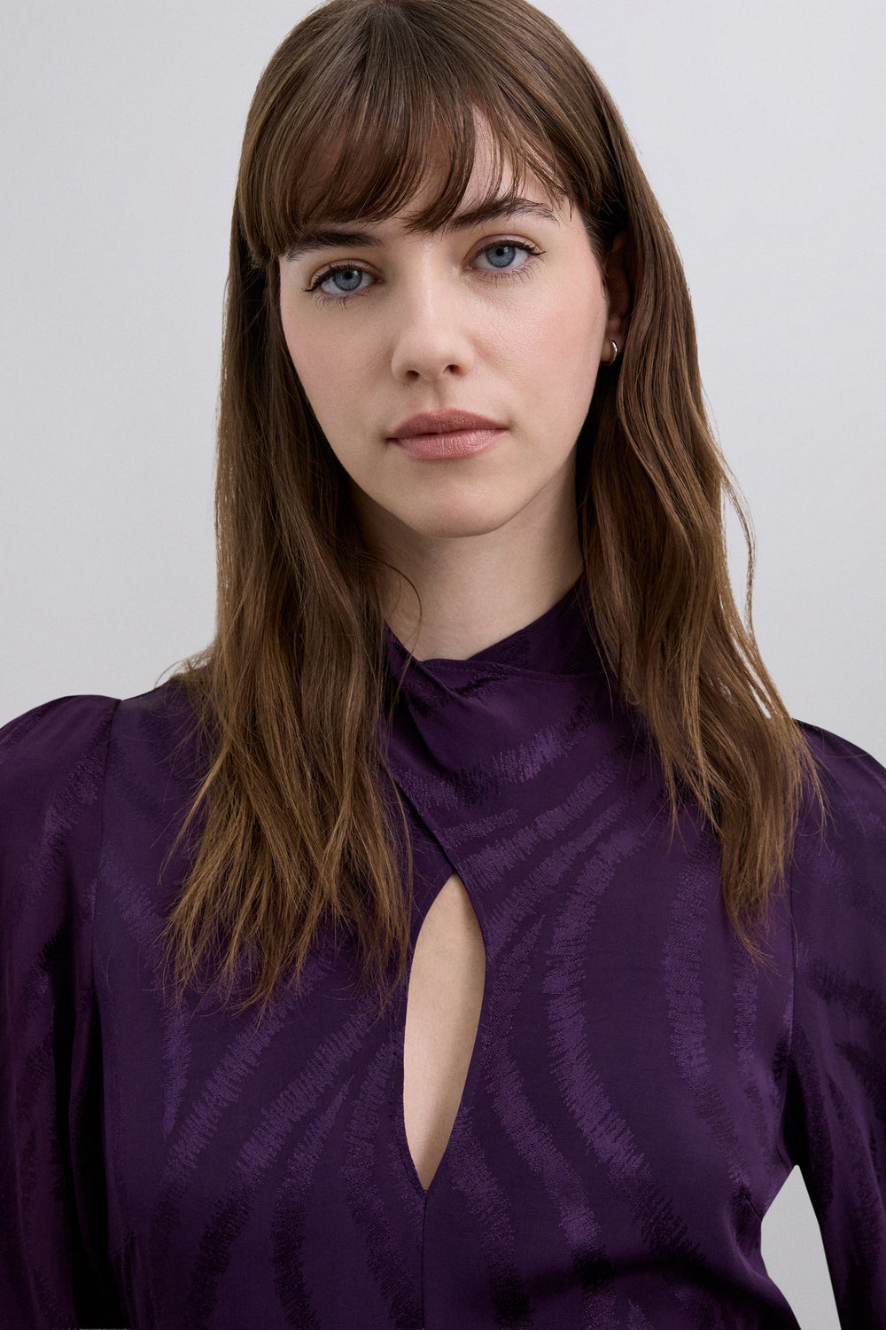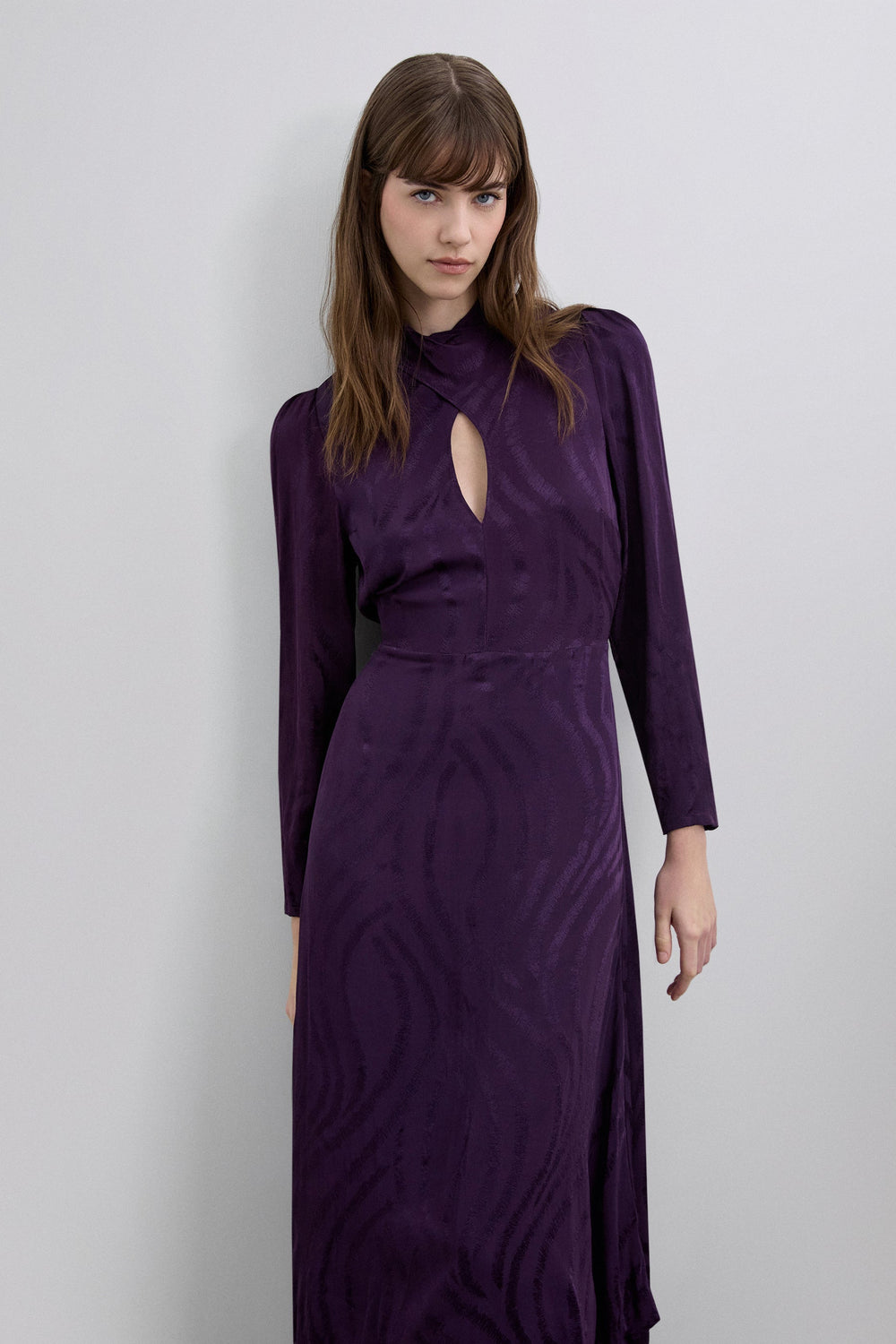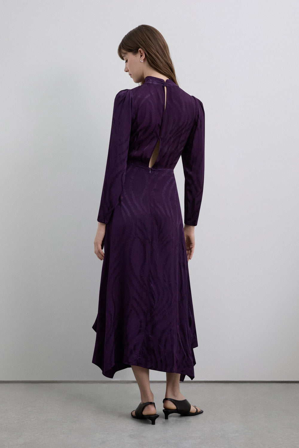 Long dress with embossed wavy design. Flowing design with uneven asymmetrical hem. Long sleeves. High closed neckline. Back fastening with invisible zip.
