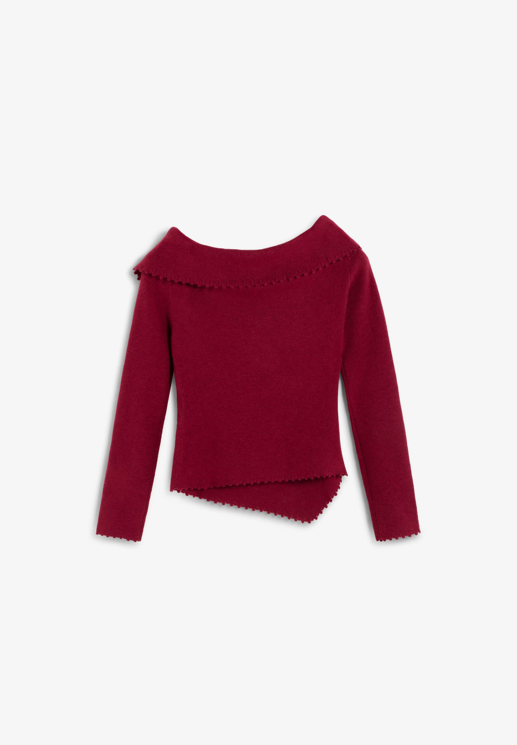 Off-shoulder sweater with long sleeves. The neckline features a double piece that folds over and drops down from the shoulders. Asymmetric hem. The neckline, hem and cuffs feature a special knitted trim.