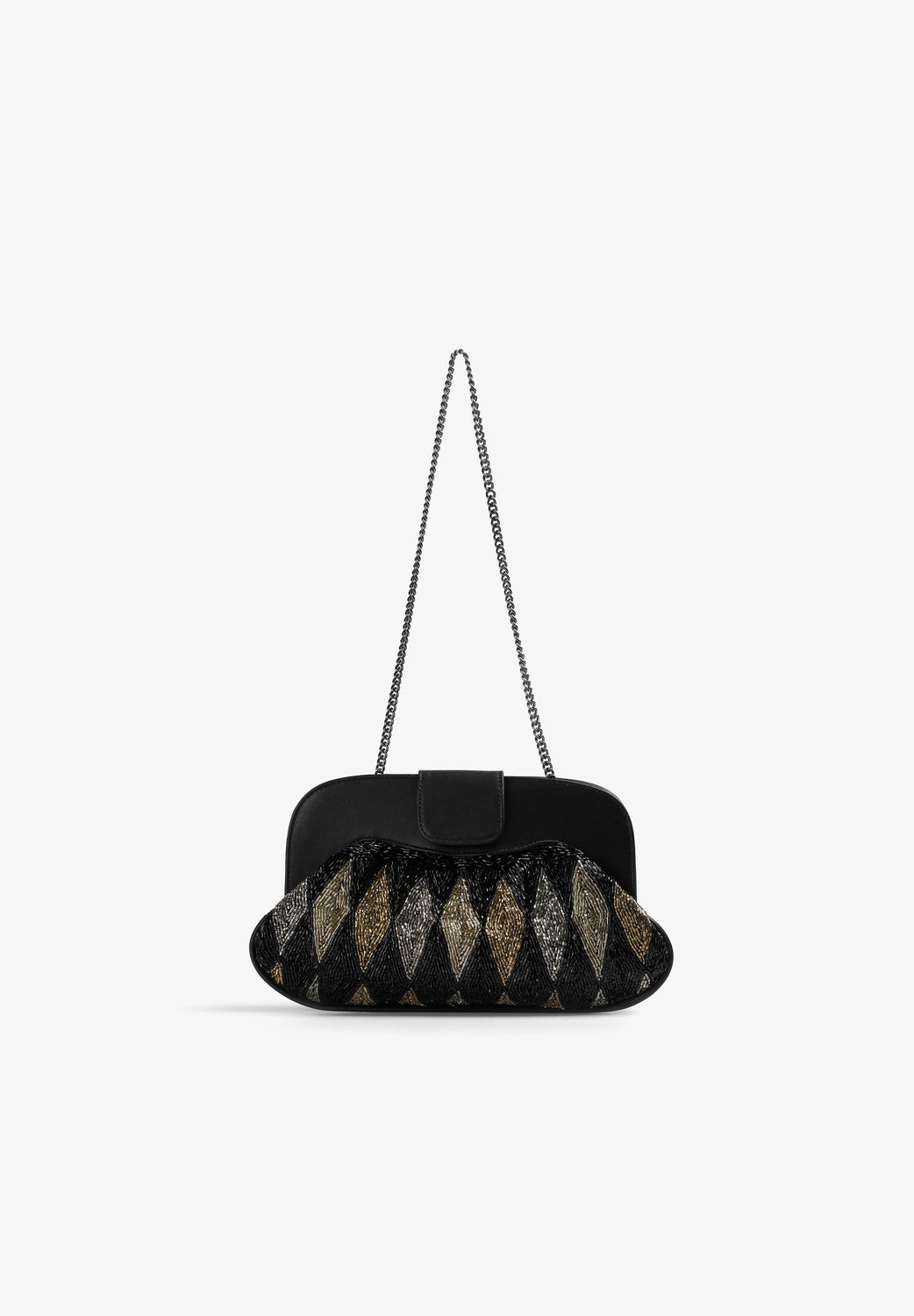 Handbag. Beaded detail. Detachable metal crossbody strap. Magnetic closure. Embroidered logo detail on the inside.