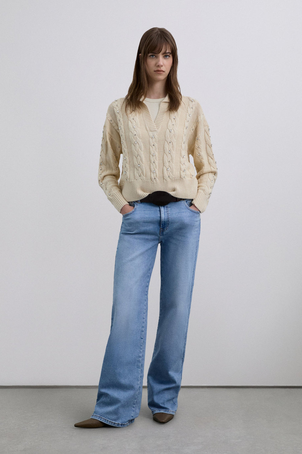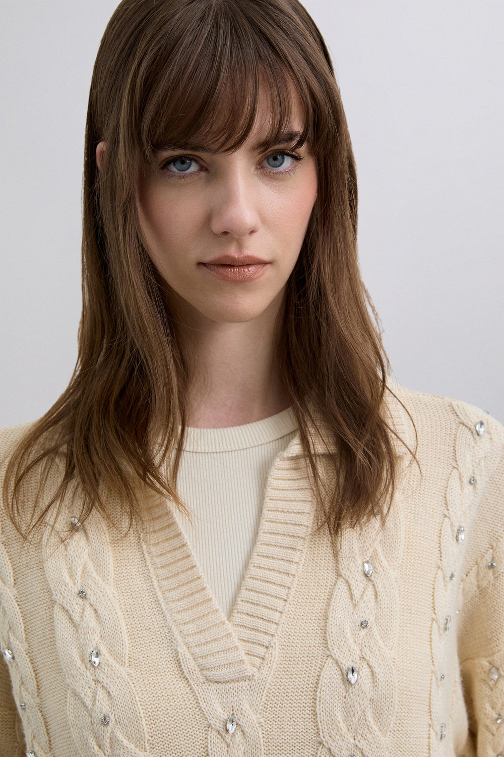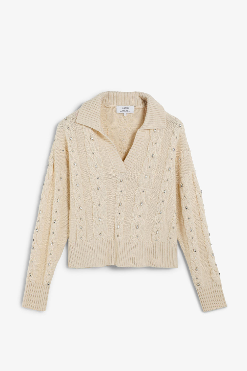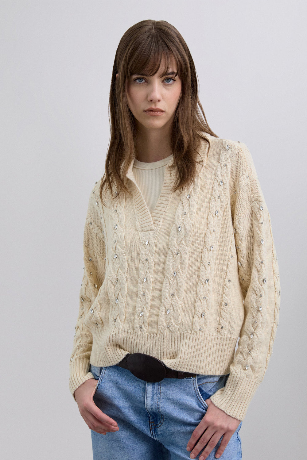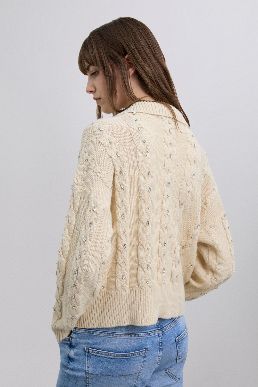 CABLE KNIT POLO SWEATER WITH RHINESTONES