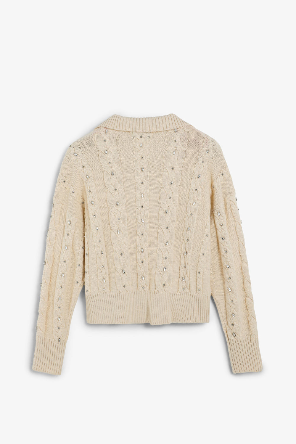 Polo shirt-style sweater made of a wool blend. Cable knit with rhinestone details. Regular fit. Polo shirt collar with ribbed trim. Long sleeves with ribbed cuffs.