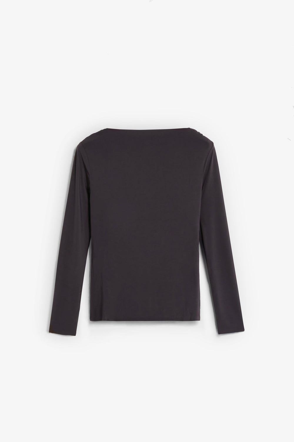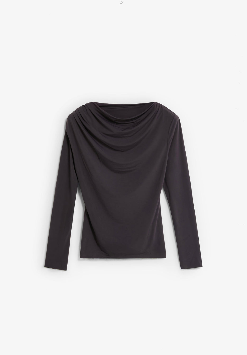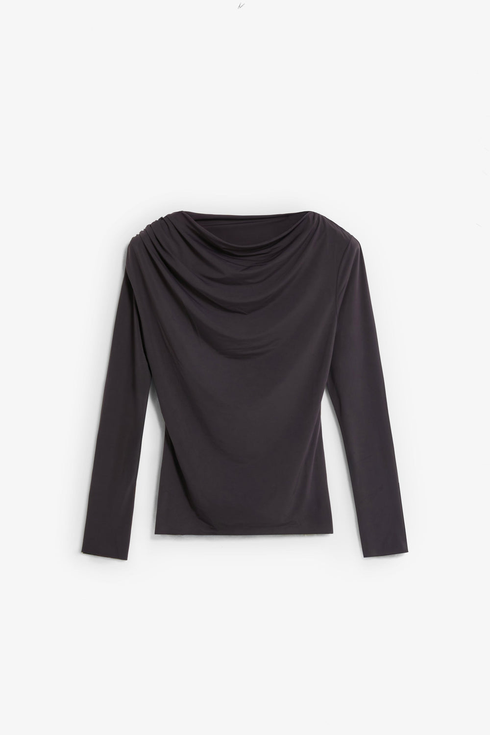 Long sleeve T-shirt with draped neckline. Shirred on one shoulder. Fitted design.