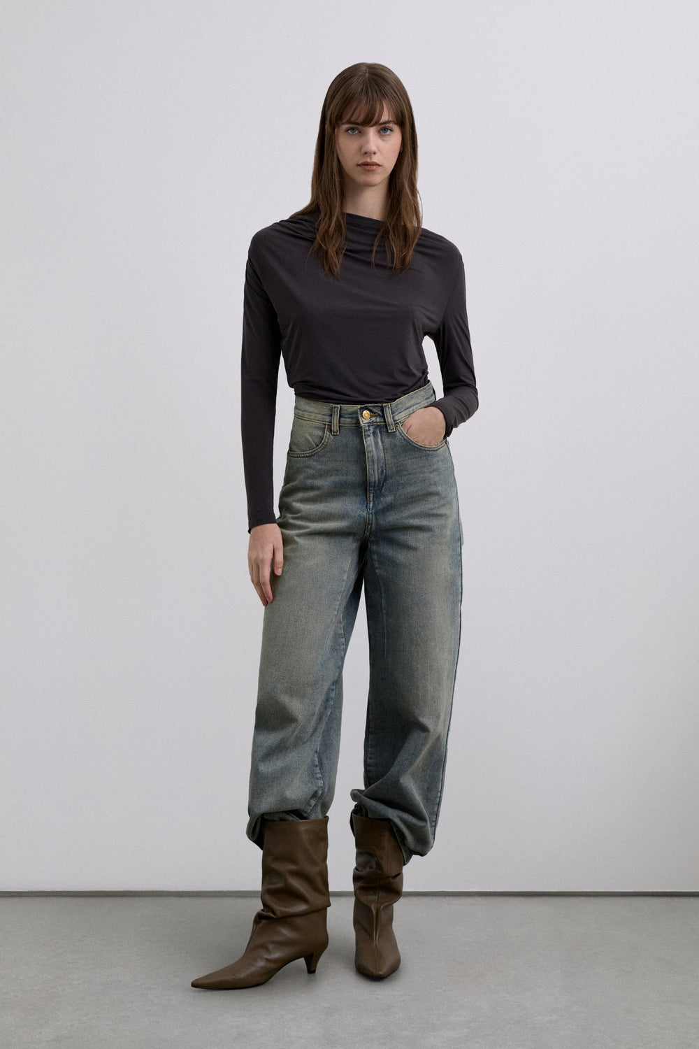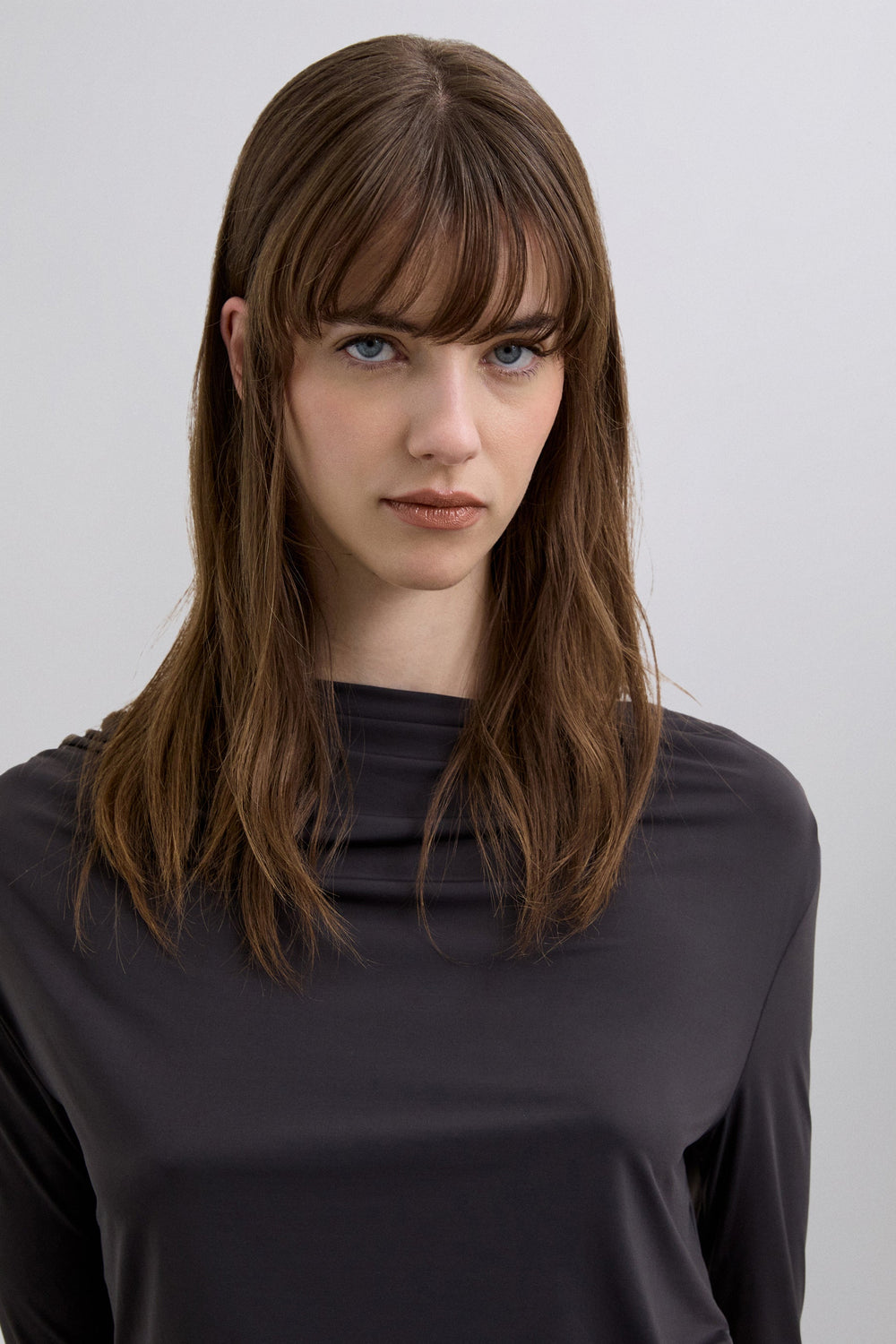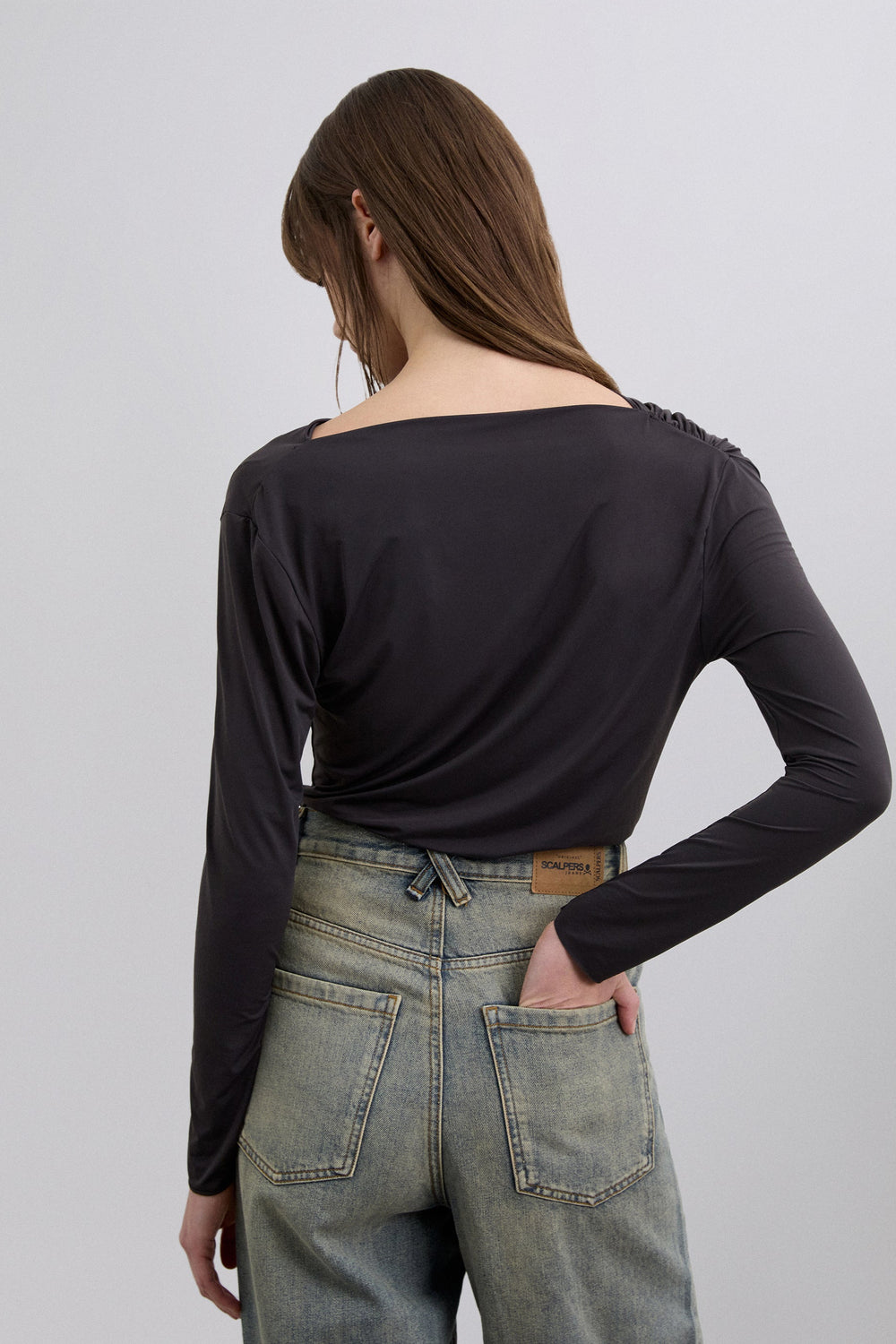 Long sleeve T-shirt with draped neckline. Shirred on one shoulder. Fitted design.
