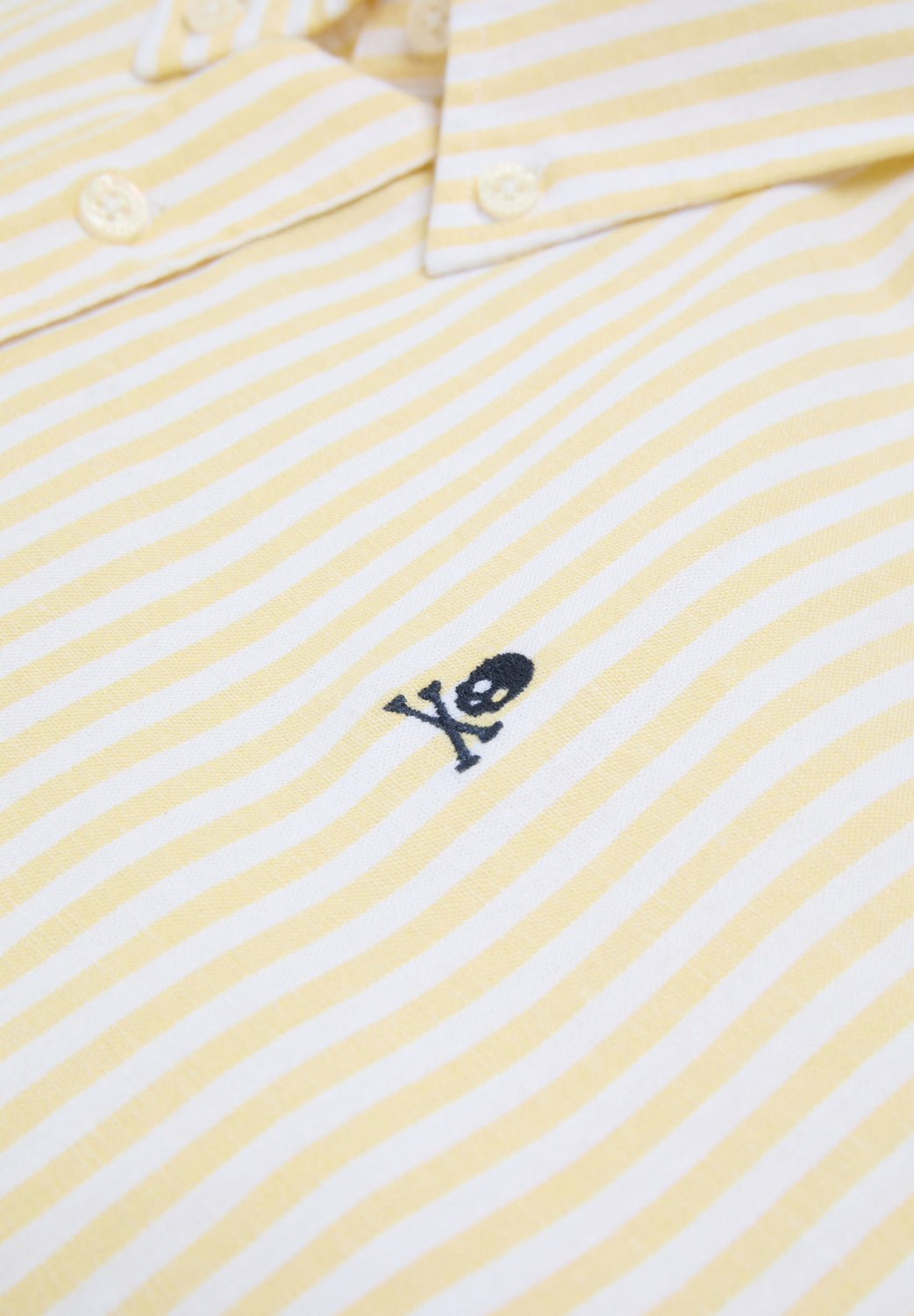 Oxford shirt made of a cotton and linen blend. Stripe print. Front button fastening. Contrast embroidered skull on the chest.