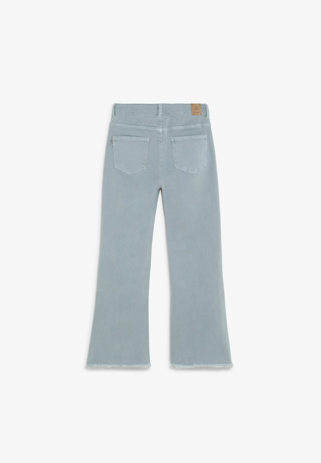 Flared trousers made of cotton. Front button and zip fastening. Belt loops at the waist. Patch pockets on front and back. Slightly flared leg from the knee. Frayed finish on the hems. Front seams. Tonal embroidered detail on left front pocket.