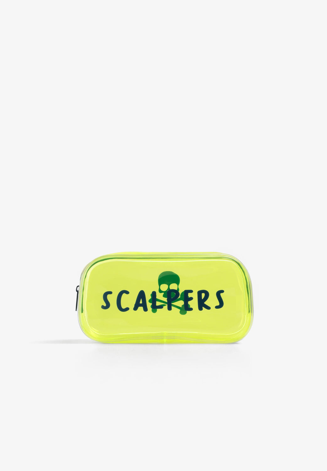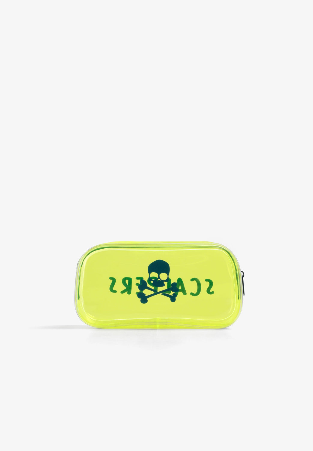 Transparent toiletry bag with zip fastening. Side print with skull and logo. Includes transparent bottles for liquids.