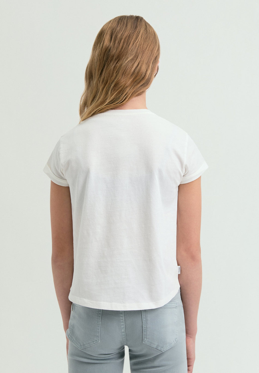 T-shirt made of 100% BCI cotton. Round neck. Short sleeve with turn-up. Front print with rhinestone detailing. Regular fit.