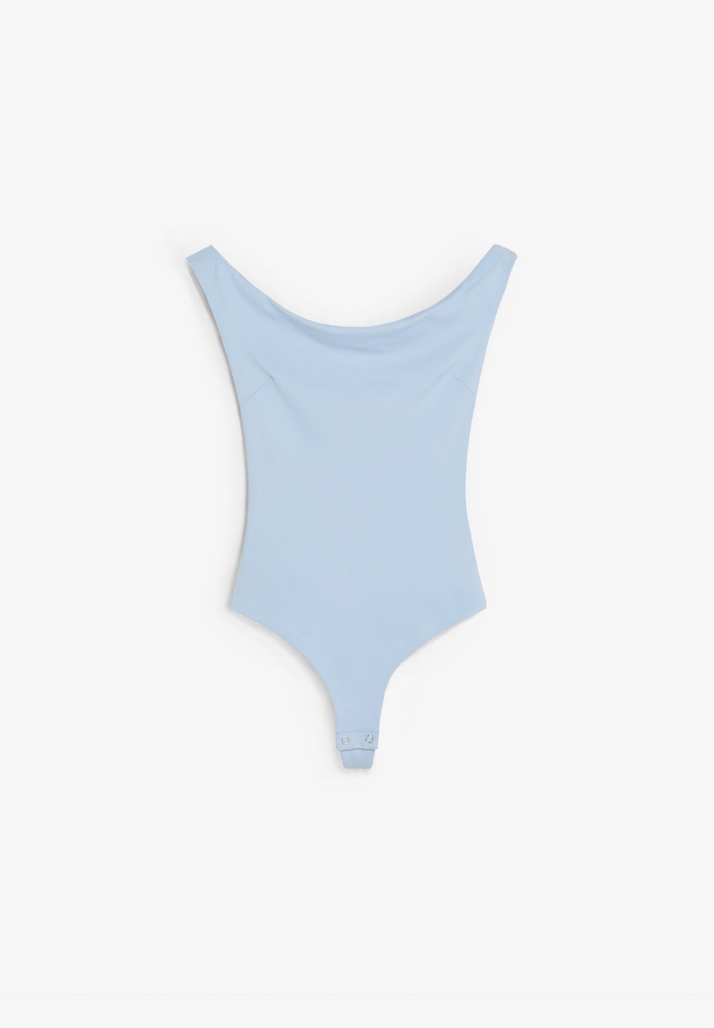 Bodysuit made of a slightly stretchy fabric. Slim fit, round neckline with off the shoulder straps.