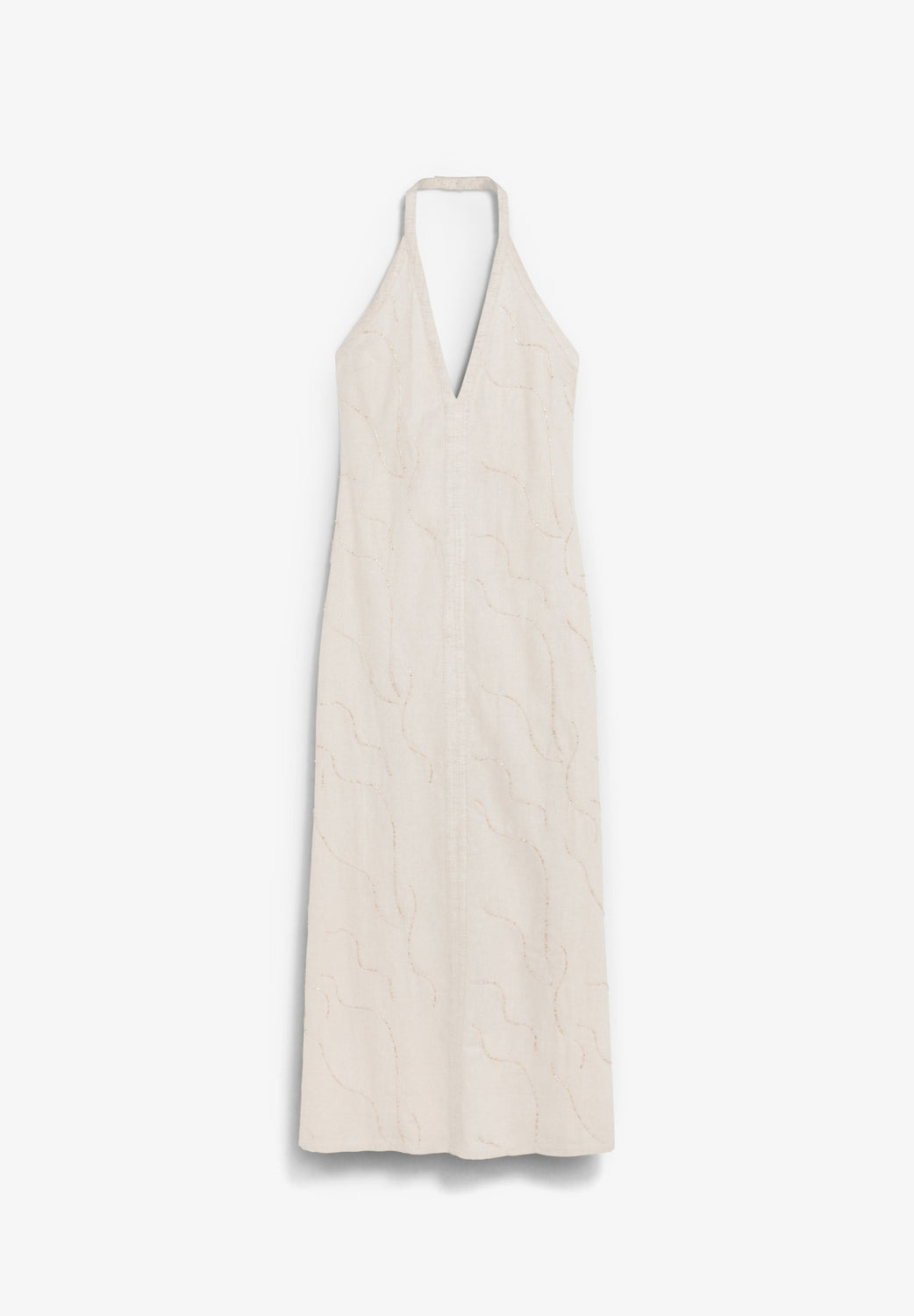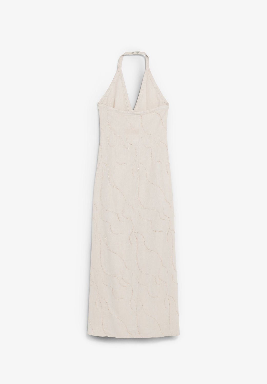 Midi dress made of a linen blend. Relaxed fit. Halter neck with V-neckline. Central seam. Wide drop skirt with embroidered beading detail. Open back and button fastening at the neck.