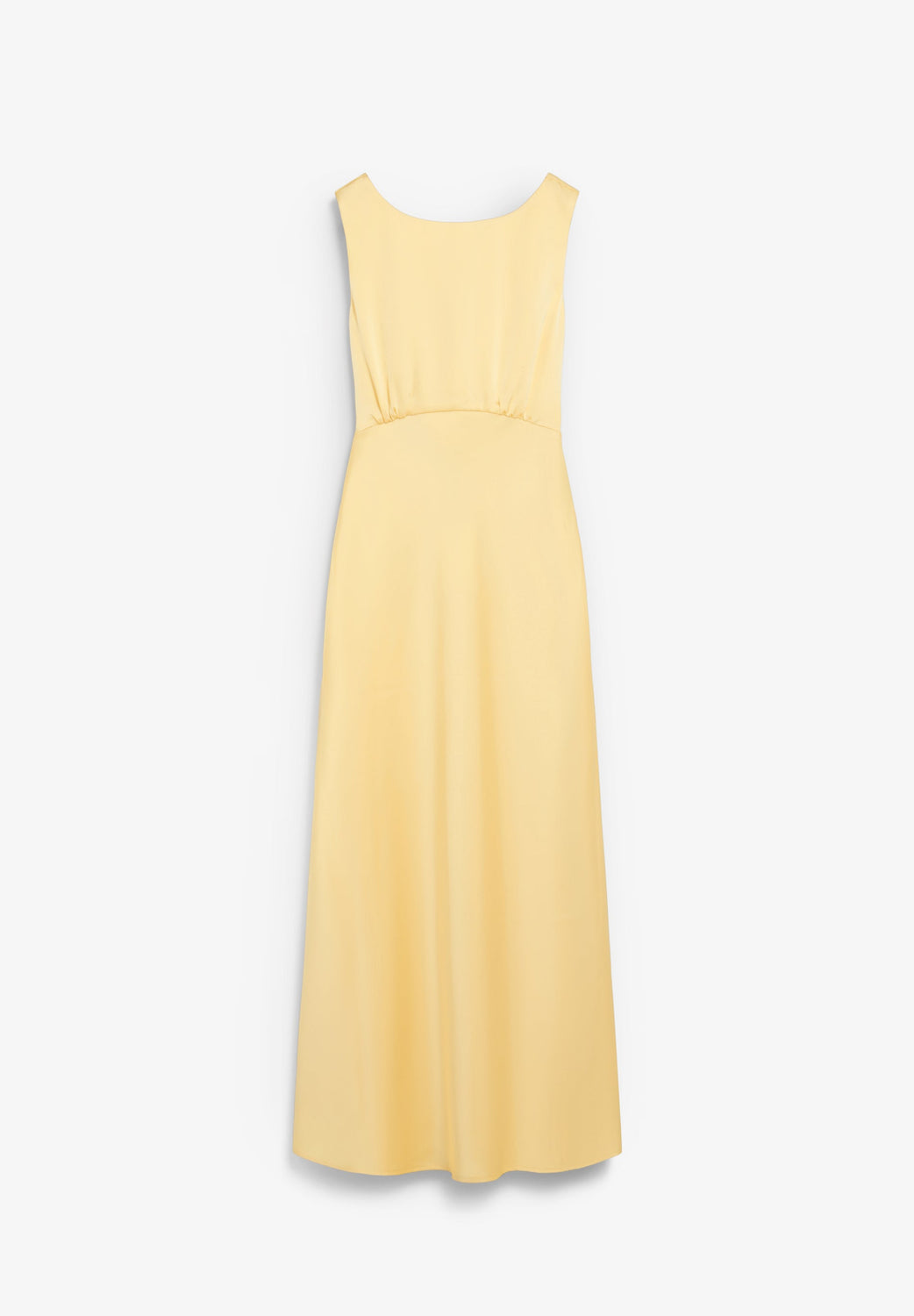 Midi dress in satin fabric. Sleeveless design with wide neckline. Waist seam and flowing skirt. Open back with draped detail and fine tie at the back of the neck. Side fastening with invisible zip.