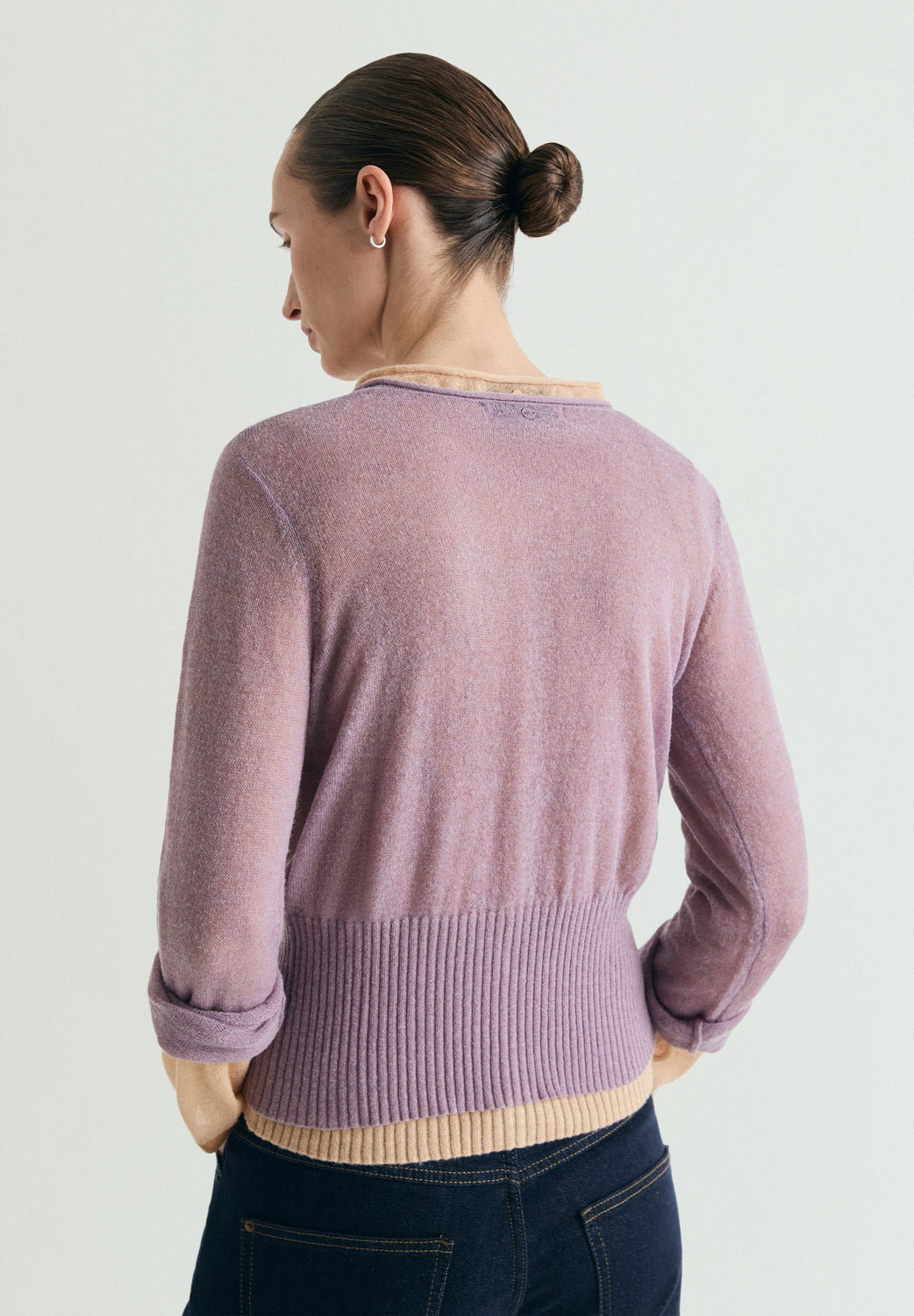 Cardigan made of a wool blend. Tie detail at the neck. Long sleeves. Fitted waist with ribbing. Front button fastening.