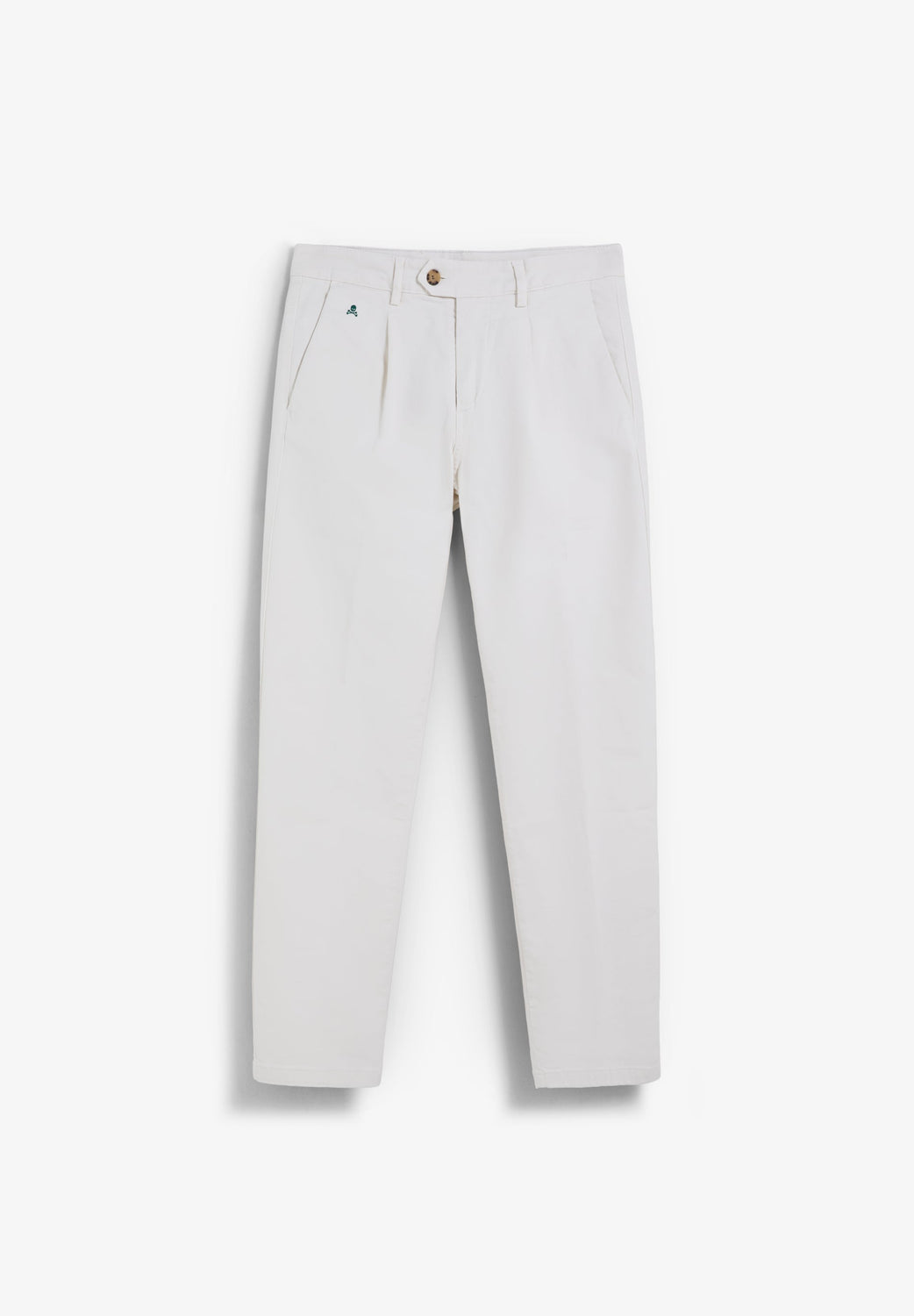 Chino trousers made of 100% cotton. Contrast embroidered on pockets. Regular Fit. Front darts. Belt loops at the waist. Zip fastening with an extended button at the waist. Side and back pockets. Made in Spain.