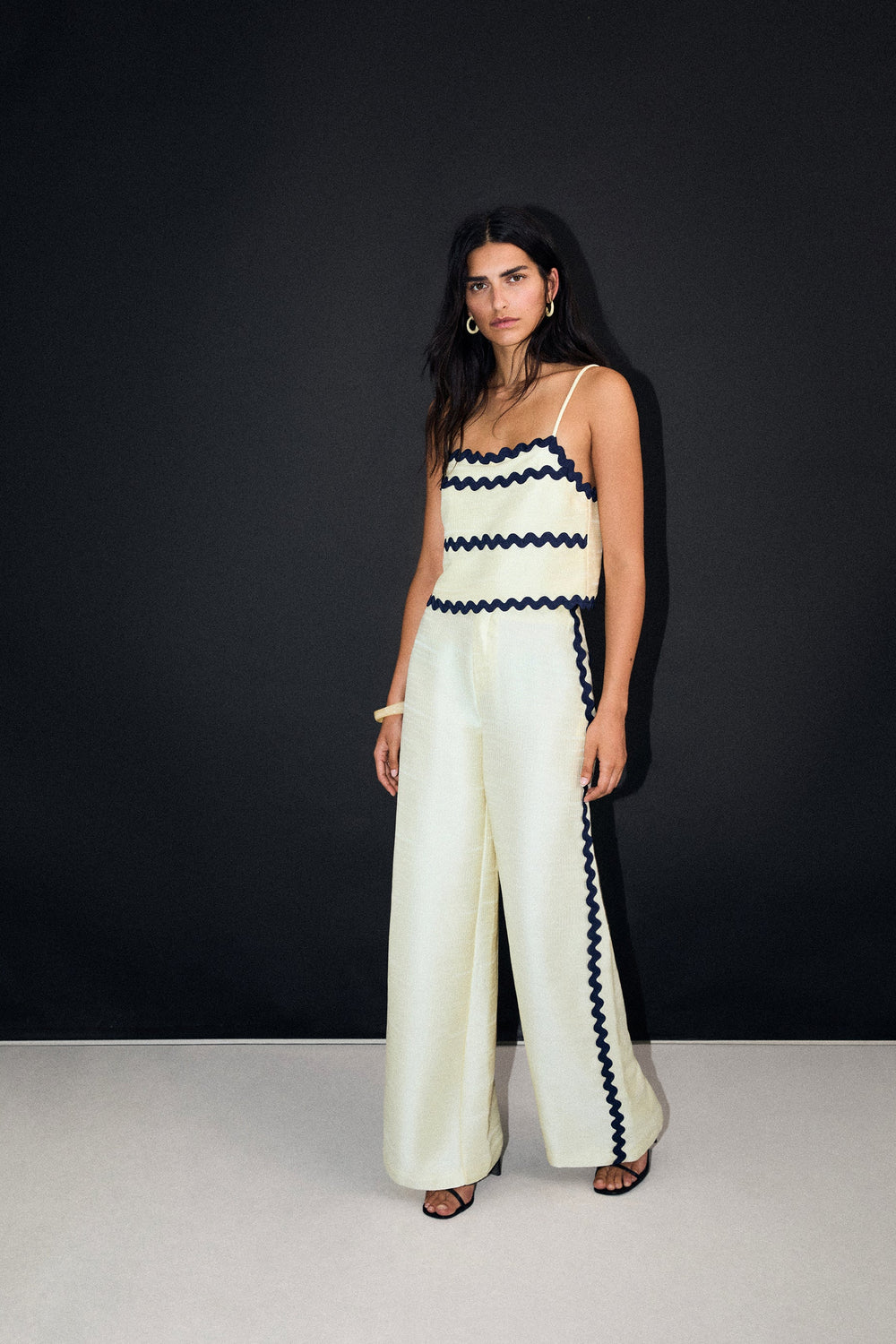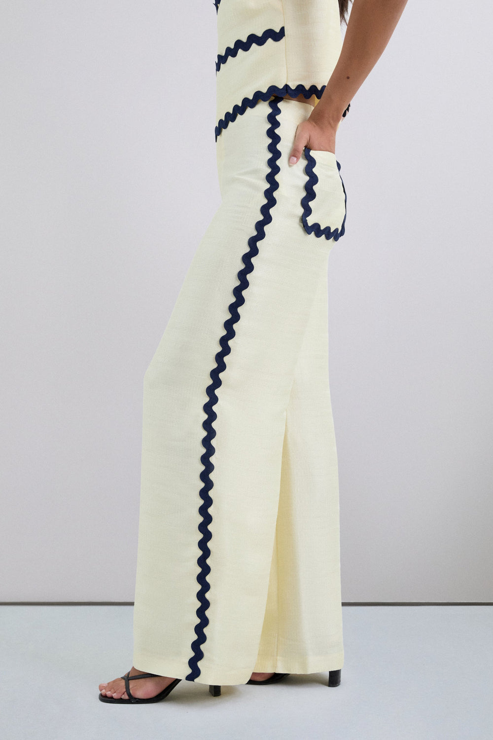 Slightly satiny full length, high waist trousers. Contrast scalloped motif. Patch pockets at the back Front hook and zip fastening.