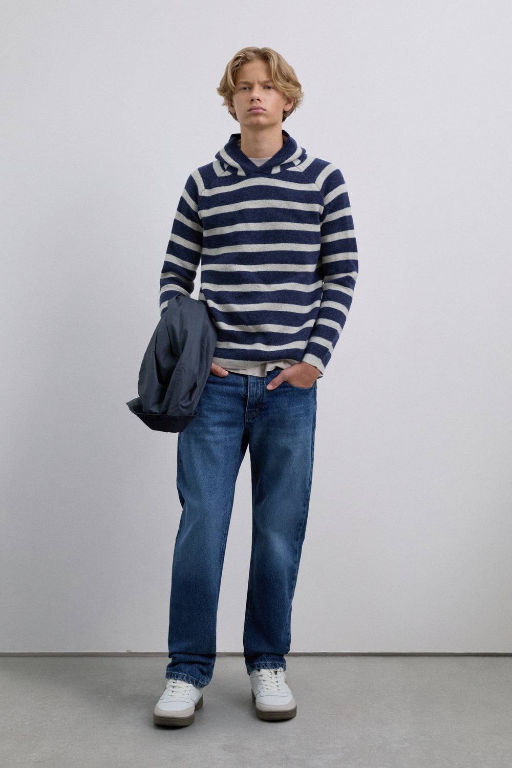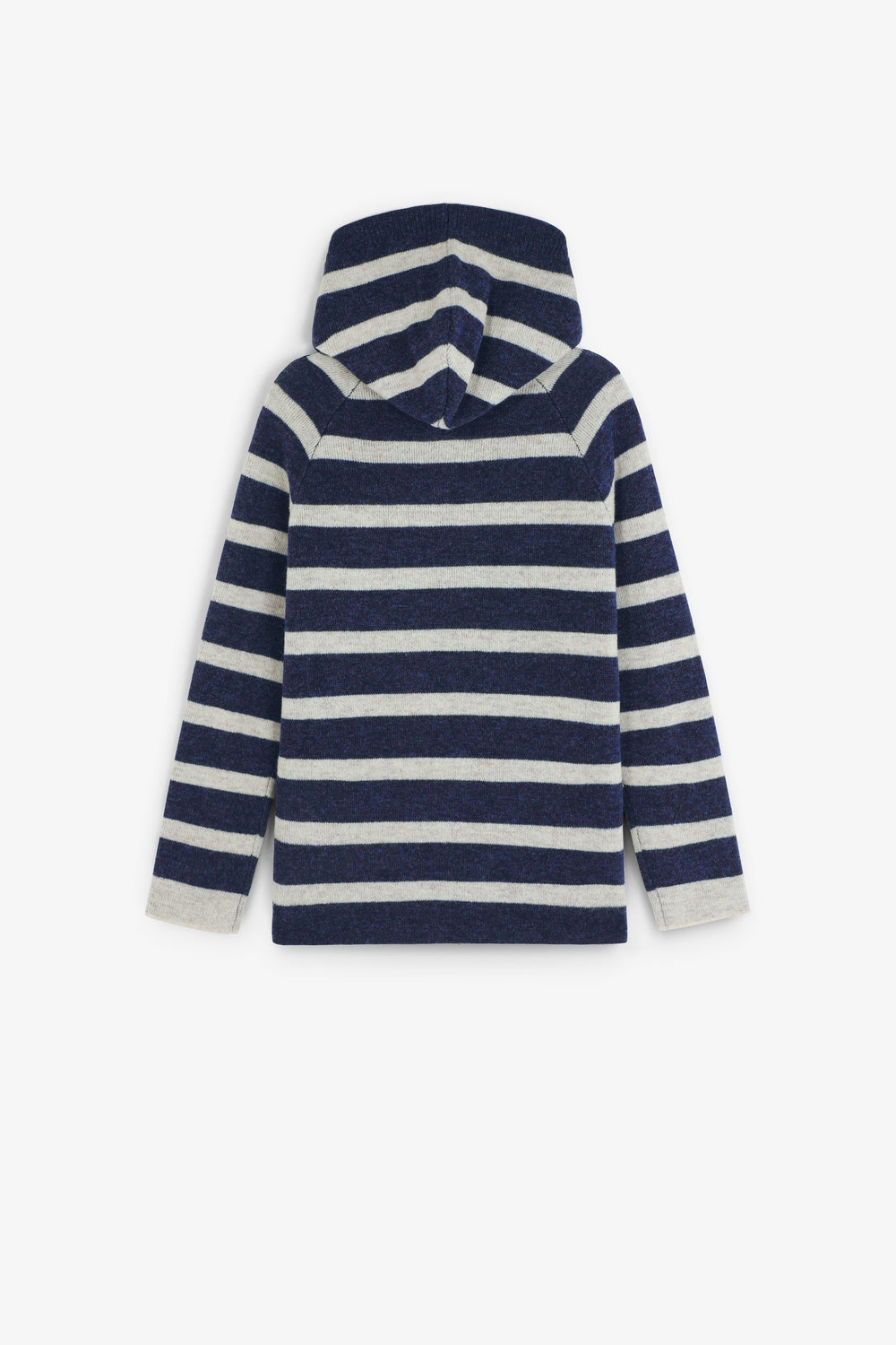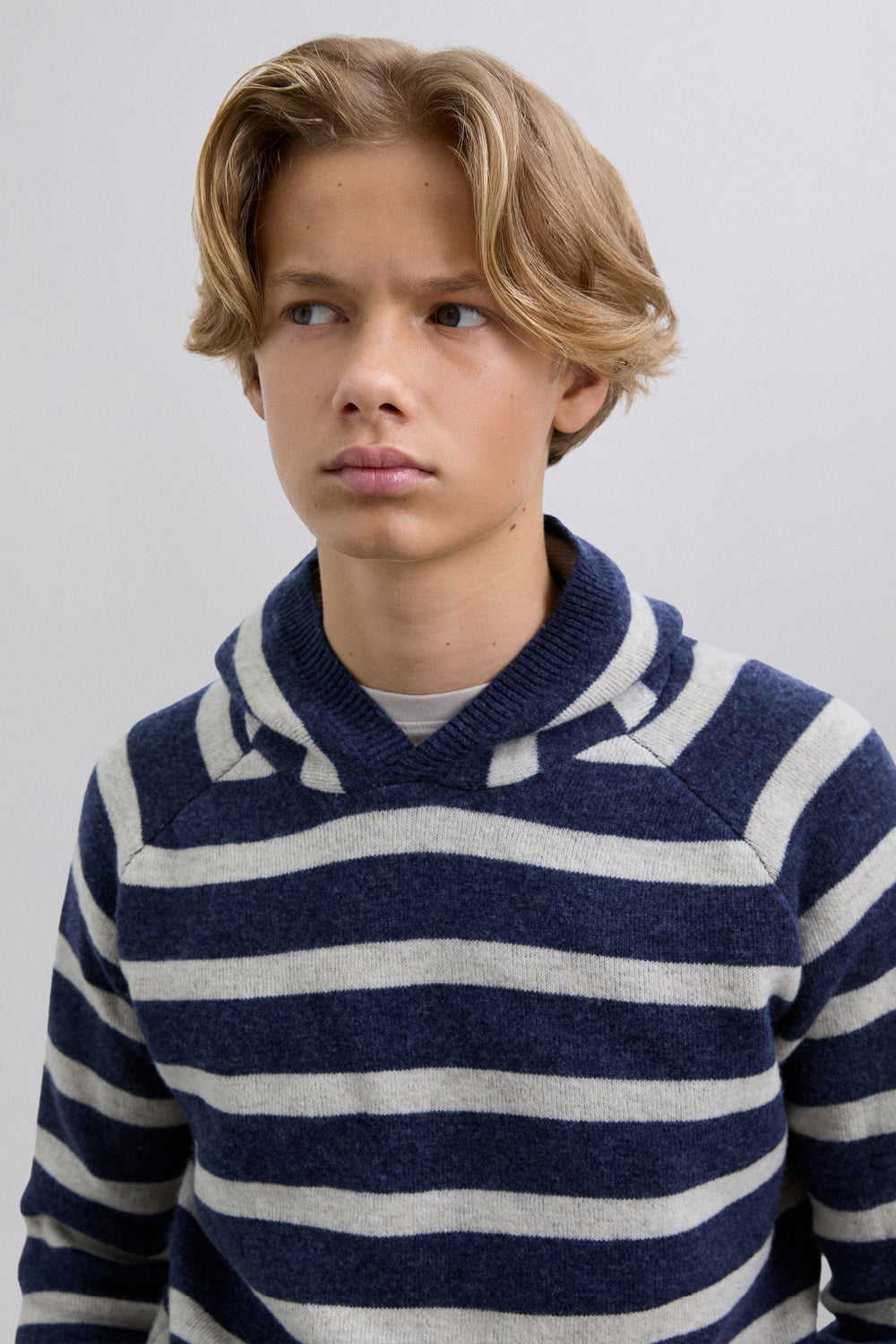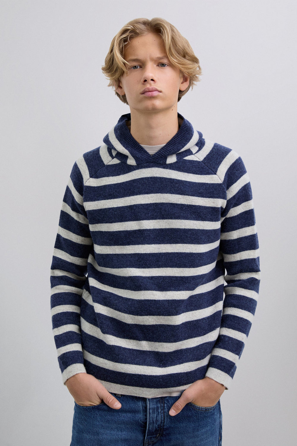 Hooded knit sweater made of a wool blend. Stripe print. Long sleeves. Contrast embroidered skull on the hem.