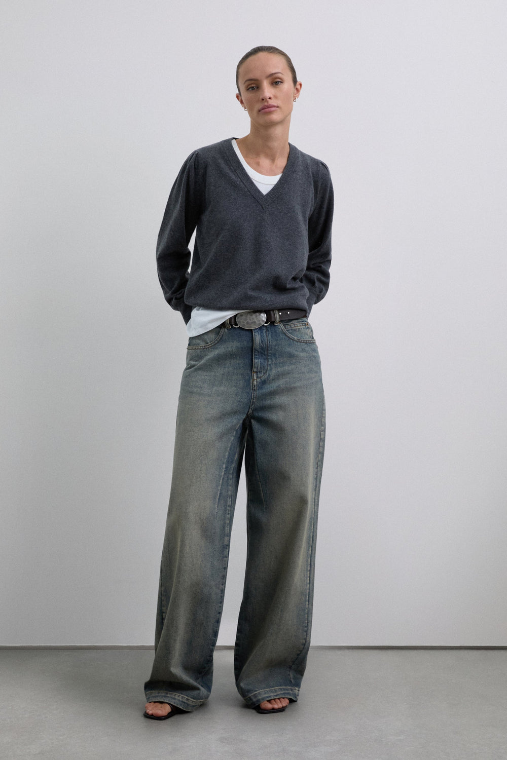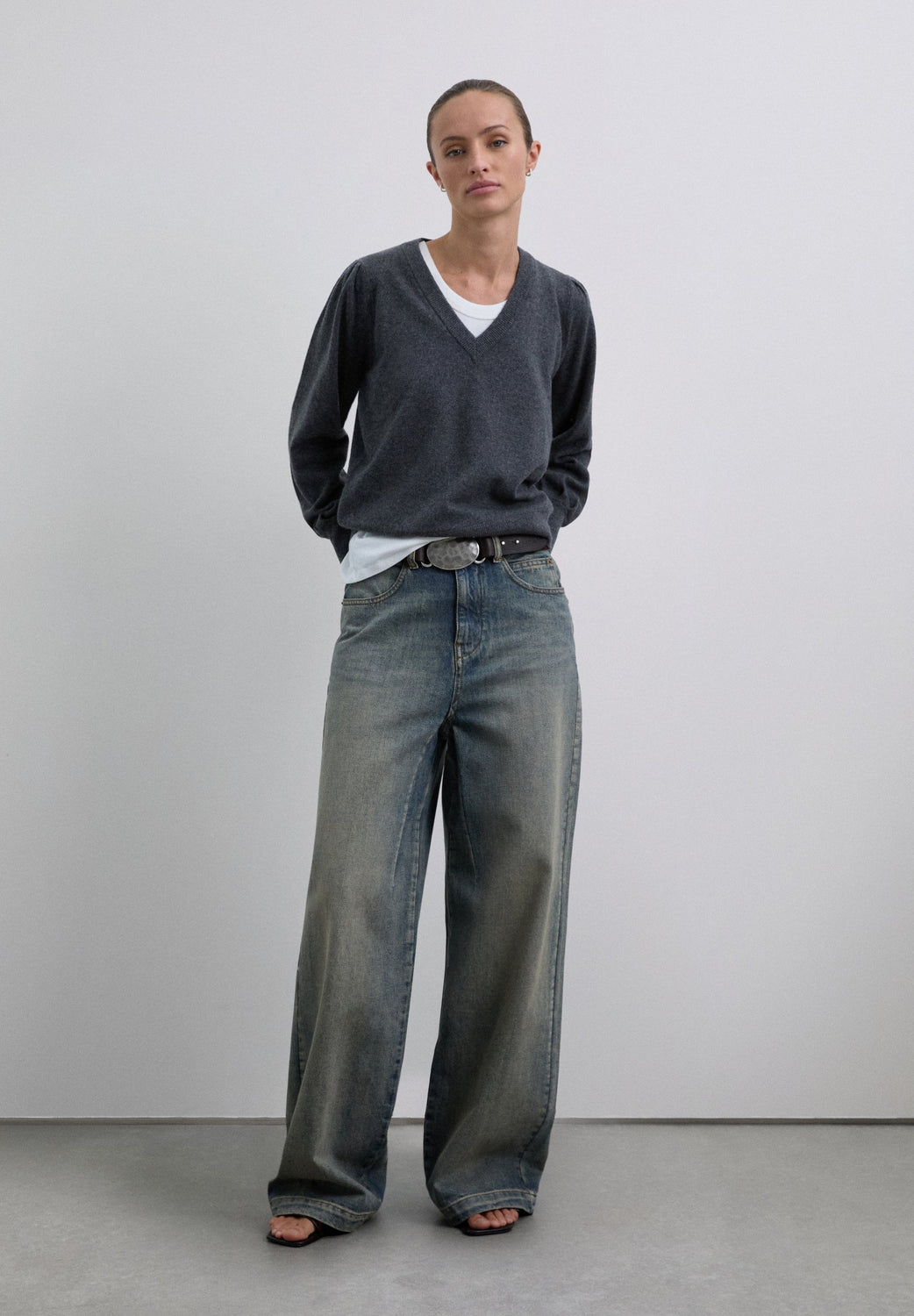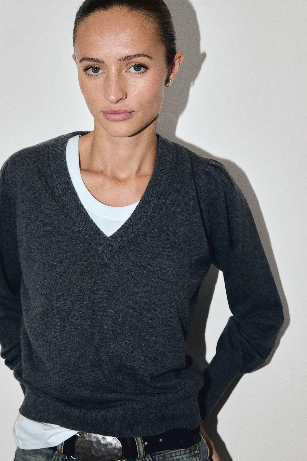 Sweater made of a wool blend with V-neck. Regular fit. Long, slightly puffed sleeves with ribbed cuffs. Matching embroidered skull detail on the back.