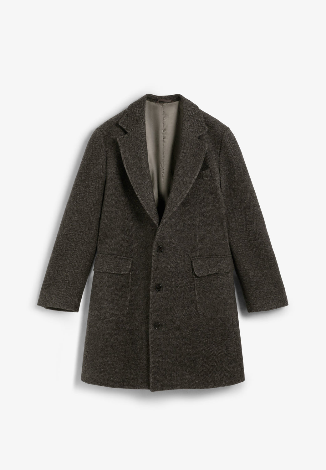 Herringbone woven coat in shades of brown. Lapel collar. Double flap pockets and front button fastening. Brushed feel.
