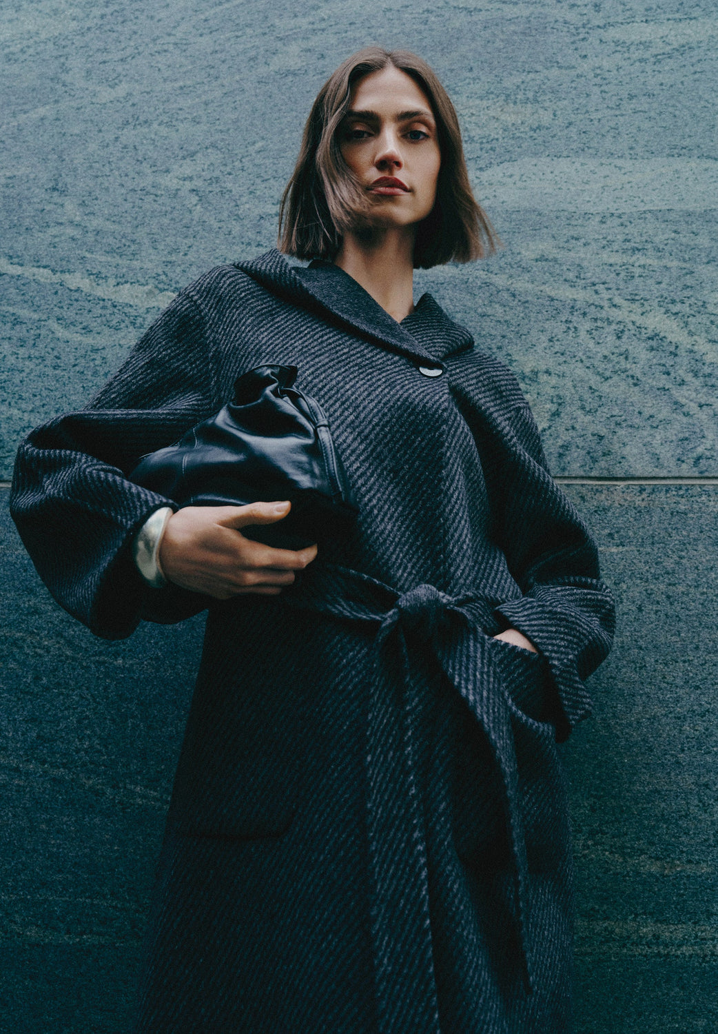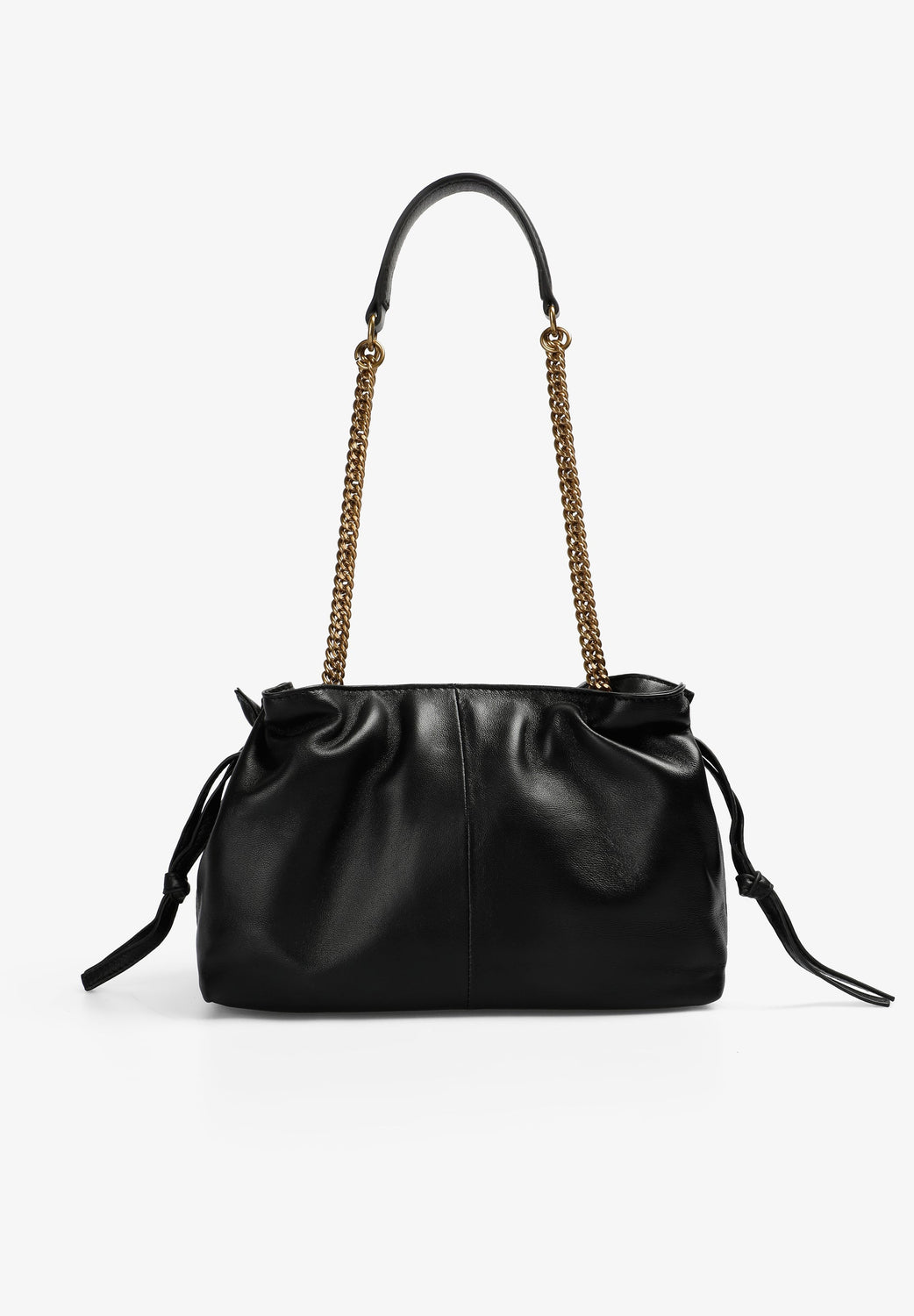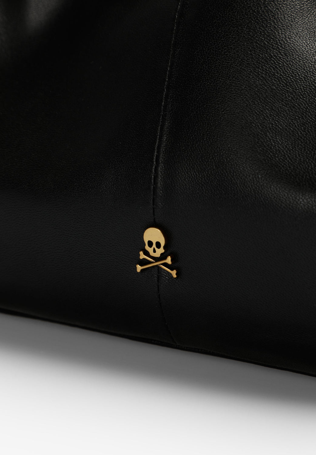 Bag made of 100% leather. Inner compartment. Shoulder chain. Button closure. Side adjusters. Front metal skull detail.
