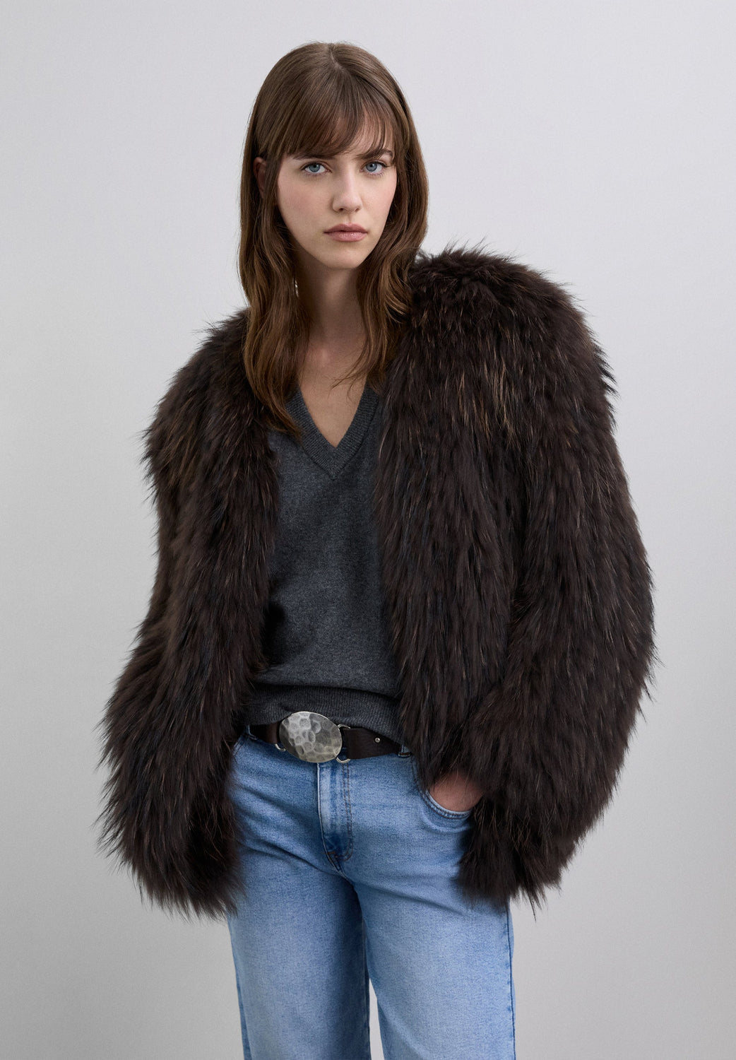 Premium jas gemaakt van 100% bont. Regular fit. V-hals. Lange mouwen. Haaksluiting.