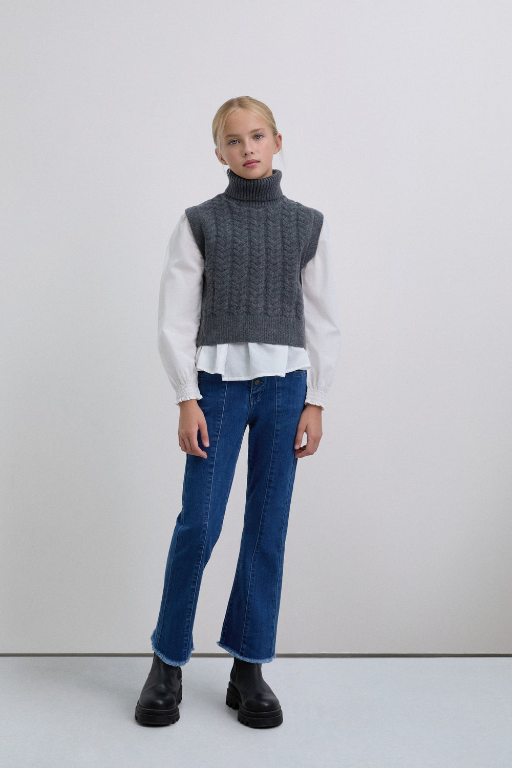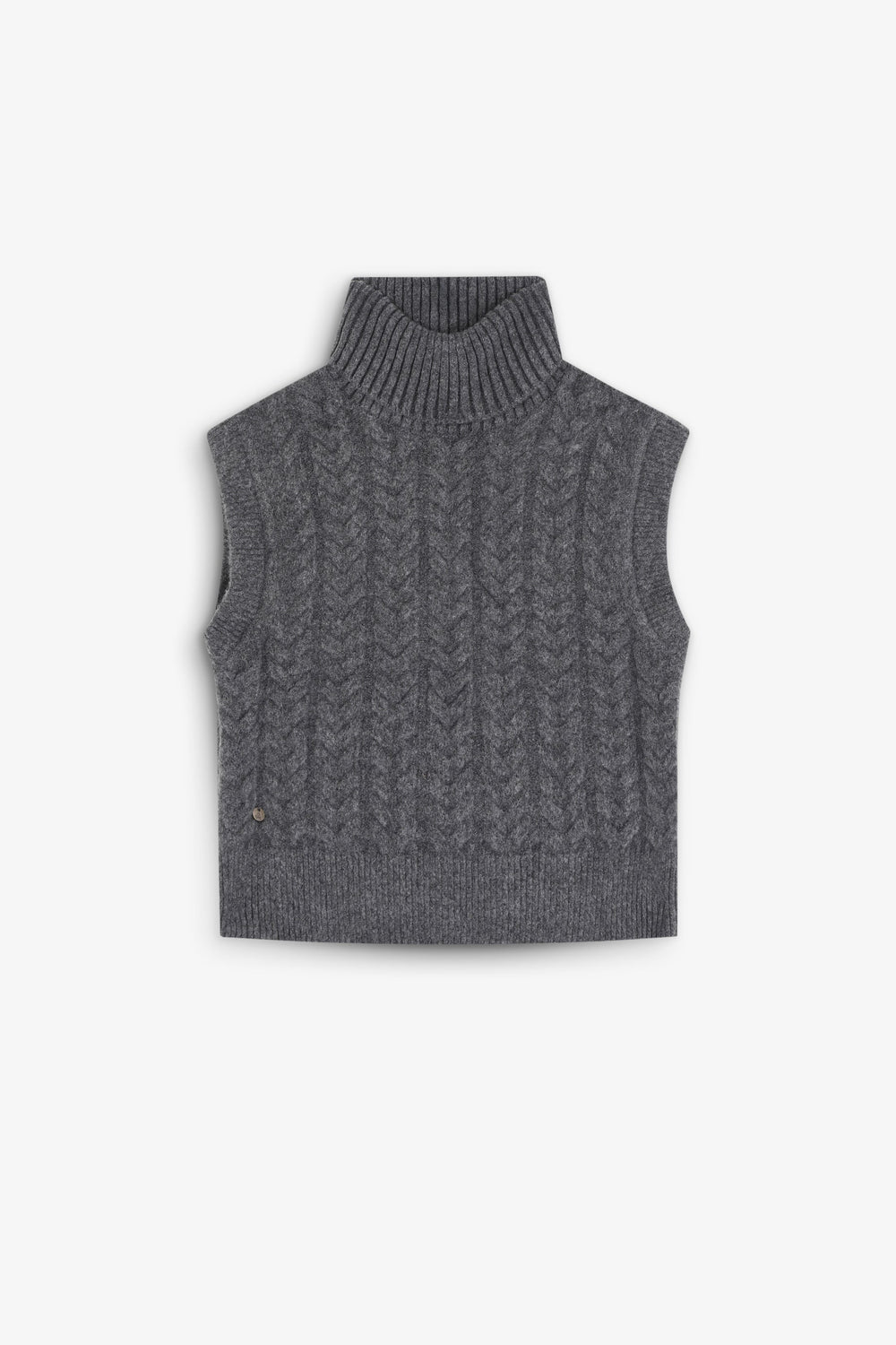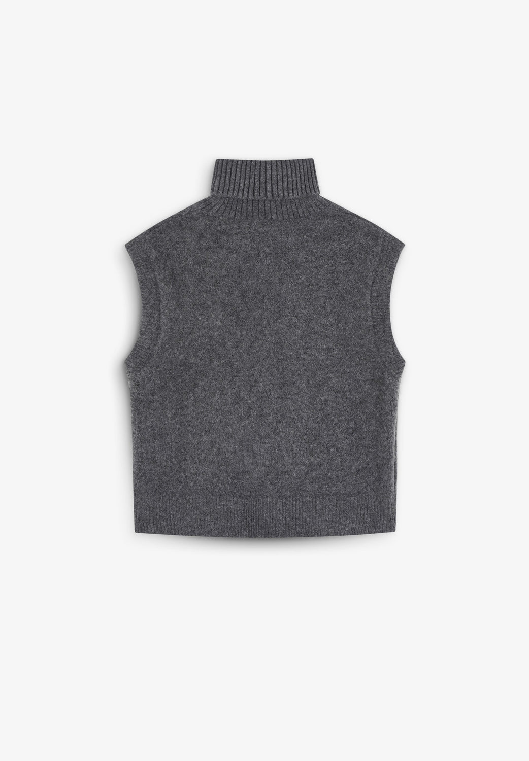 Tricot gilet. Omgeslagen kraag. Ribboorden Doodshoofd op metalen plaatje.