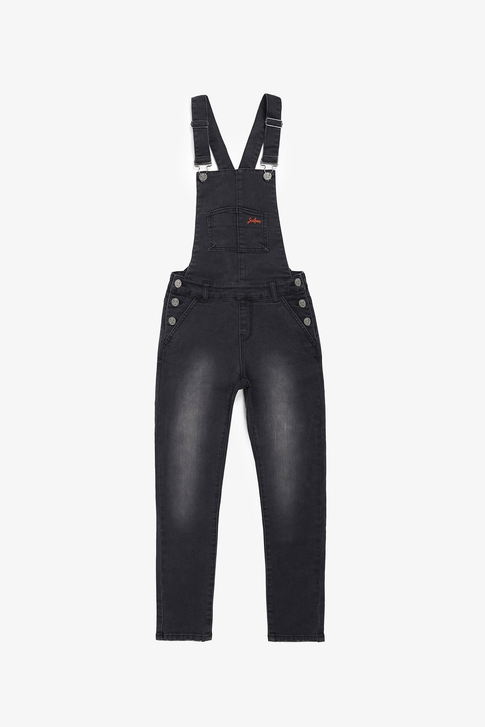 Denim dungarees. Slim fit with skinny legs, button fastening at side and adjustable straps. Front and pocket detail and side pockets.