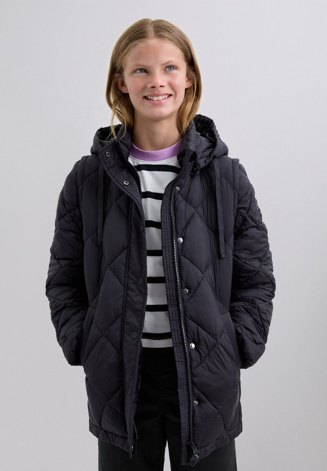 Padded coat. Detachable hood and sleeves. Front zip fastening concealed by placket with press stud fastening. Side pockets. Recycled fleece lining. Logo detail on the back.