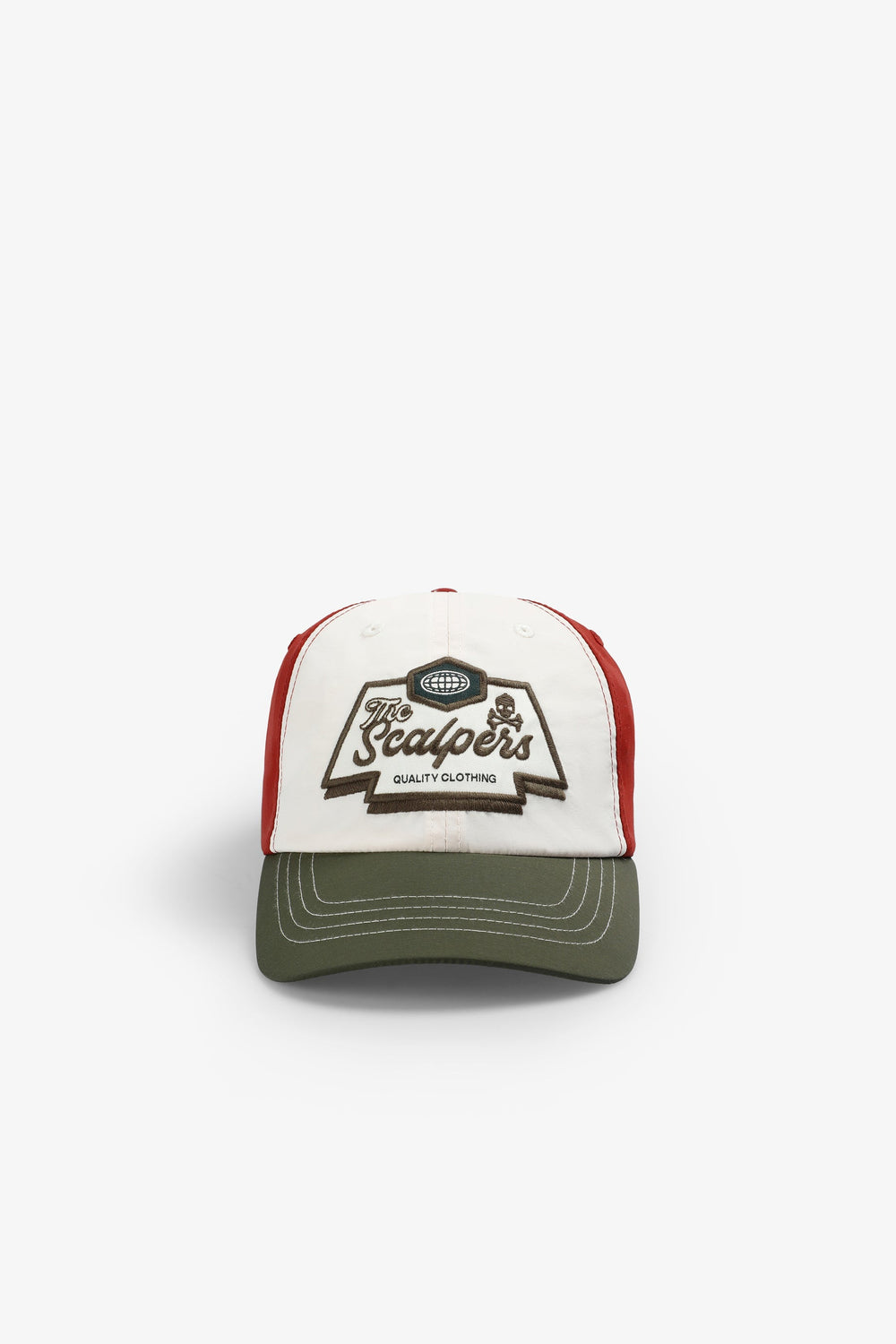 Three-tone cap made of 100% nylon. Adjustable back and front embroidered print with contrast skull. Logo label detail at the back.