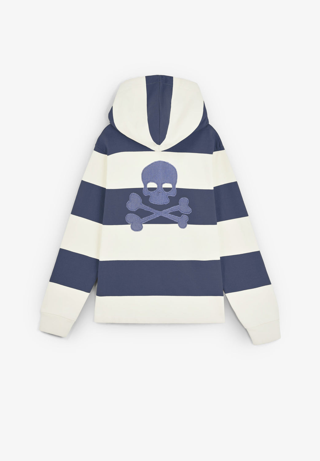 Sweatshirt with adjustable drawstring hood, made of 100% BCI cotton. Stripe print. Logo print on chest and embroidered skull on back. Half front opening.