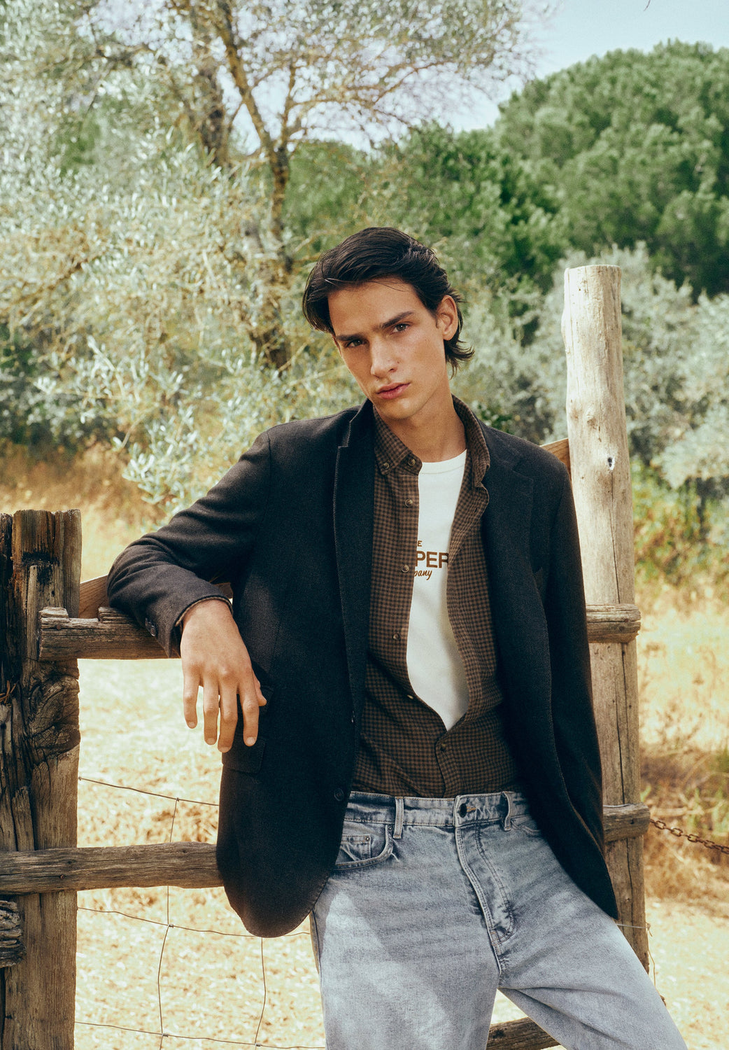 Blazer made of wool. Herringbone design. Three flap pockets. Two button fastening. Chest pocket with piping. Long sleeves.