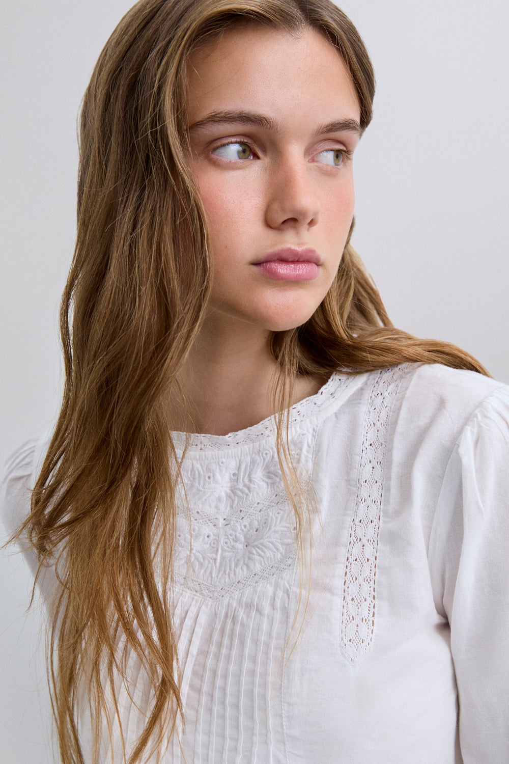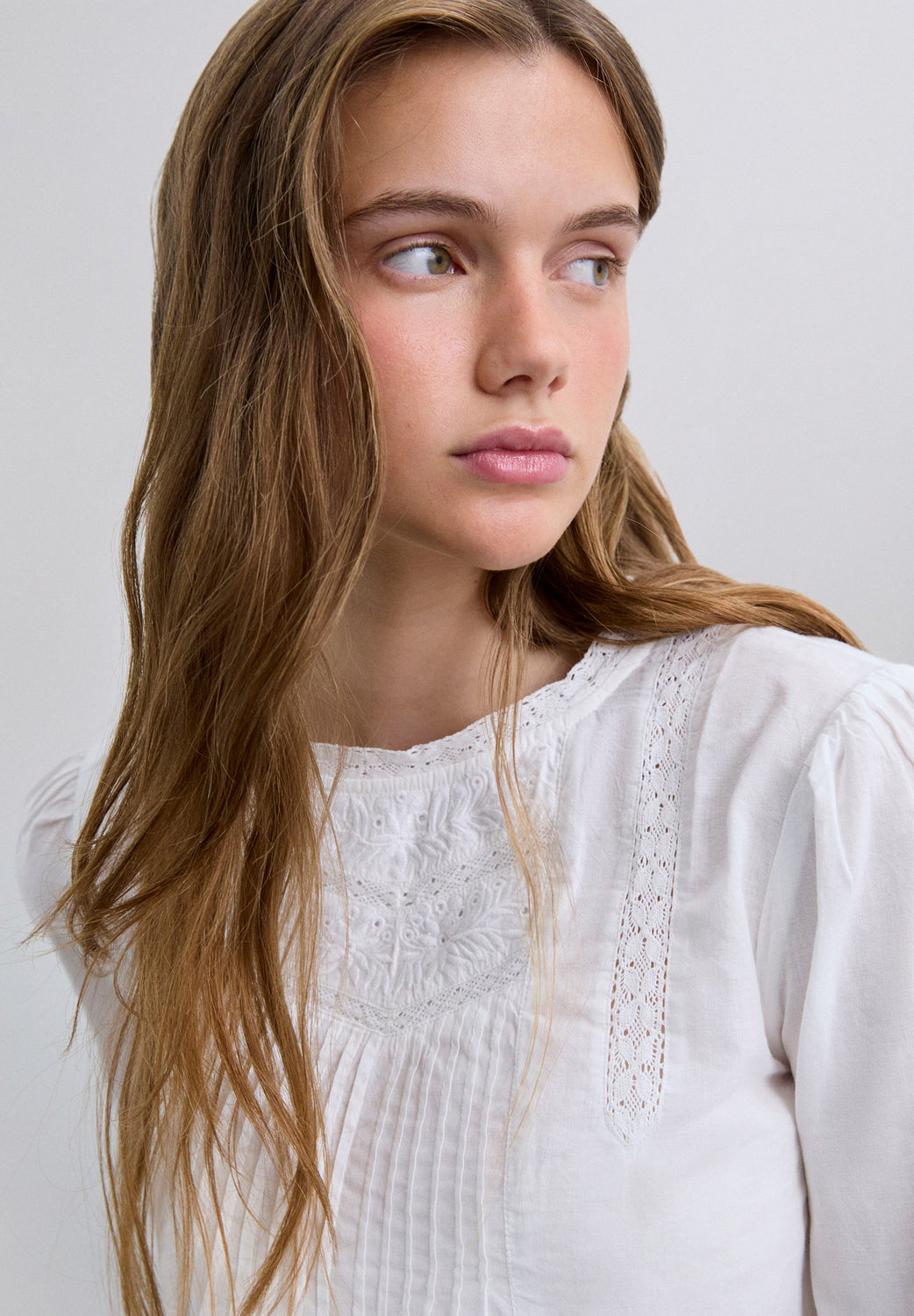 Blouse made of 100% BCI cotton. Regular fit. Round neck. Long puff sleeves with elastic trim. Metallic logo detail on waistband. Embroidered details on collar and front. Back button fastening.