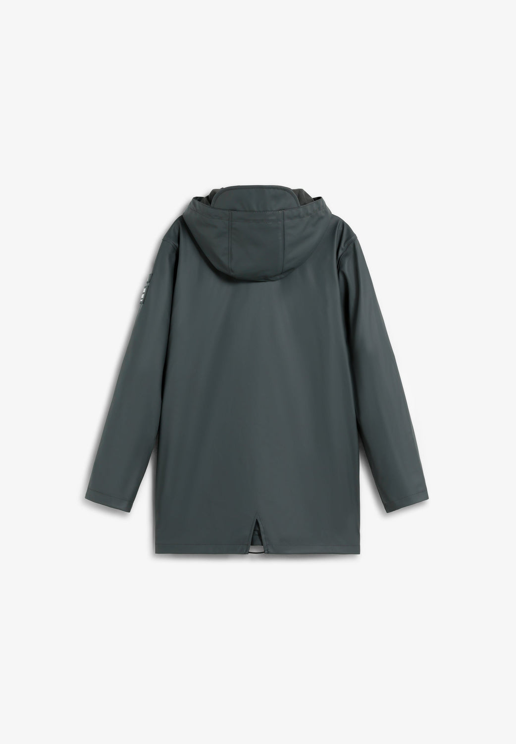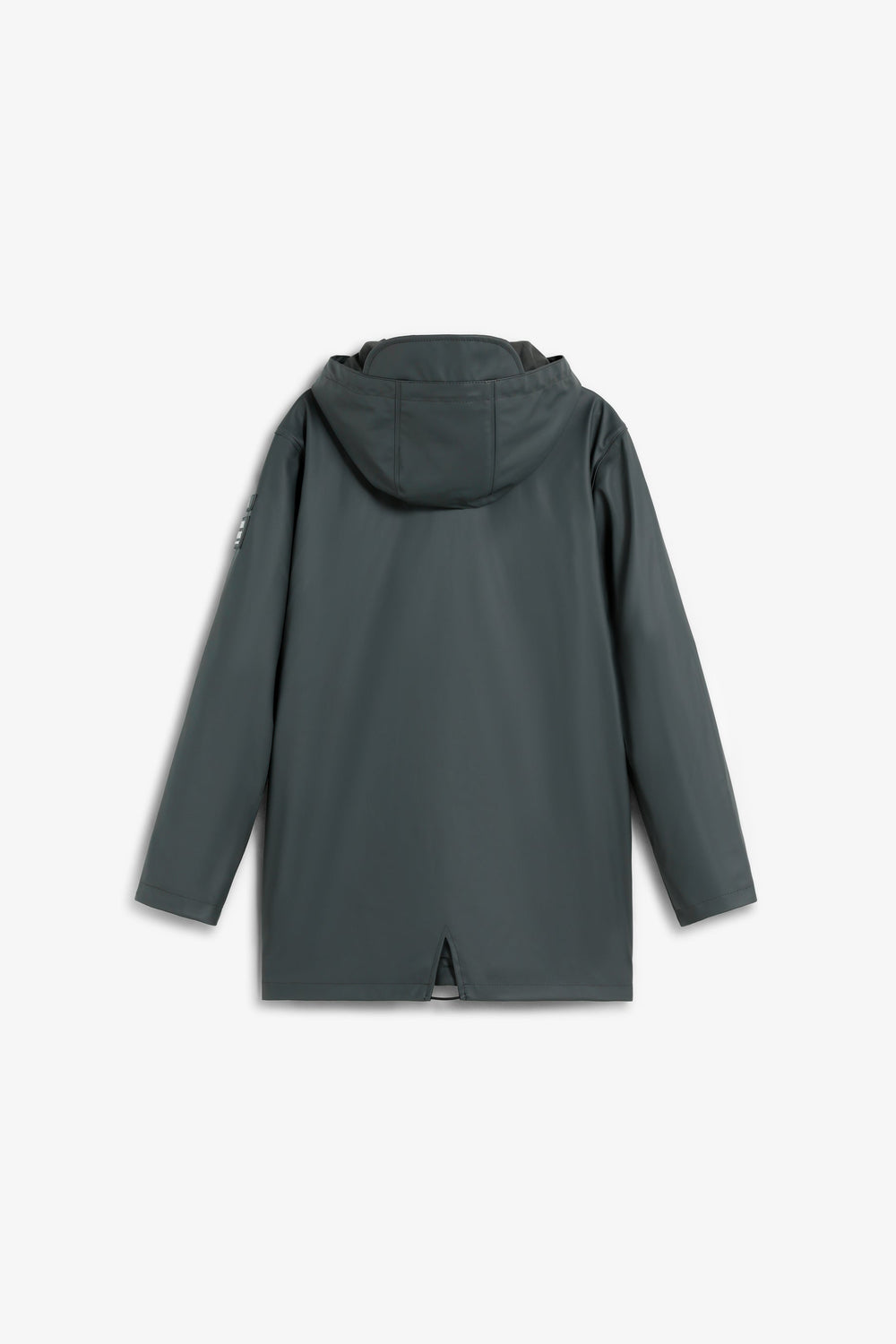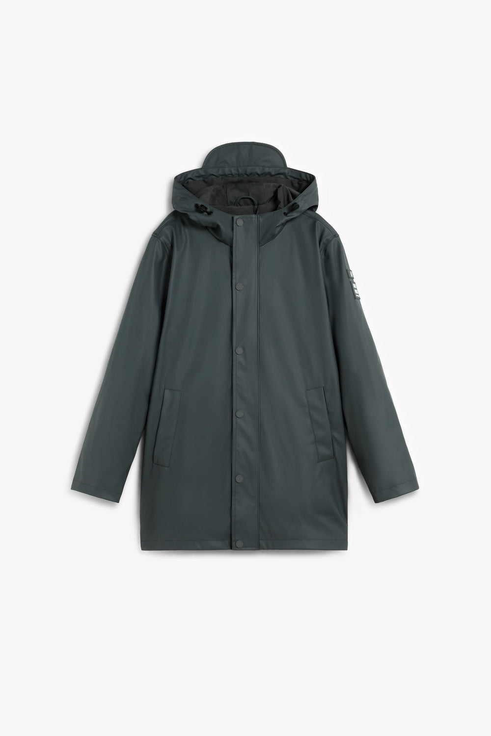 Waterproof parka with adjustable hood. Side pockets with placket and snap button. Synthetic lining. Rubber logo patch detail and skull. Button fastening. Long sleeves.
