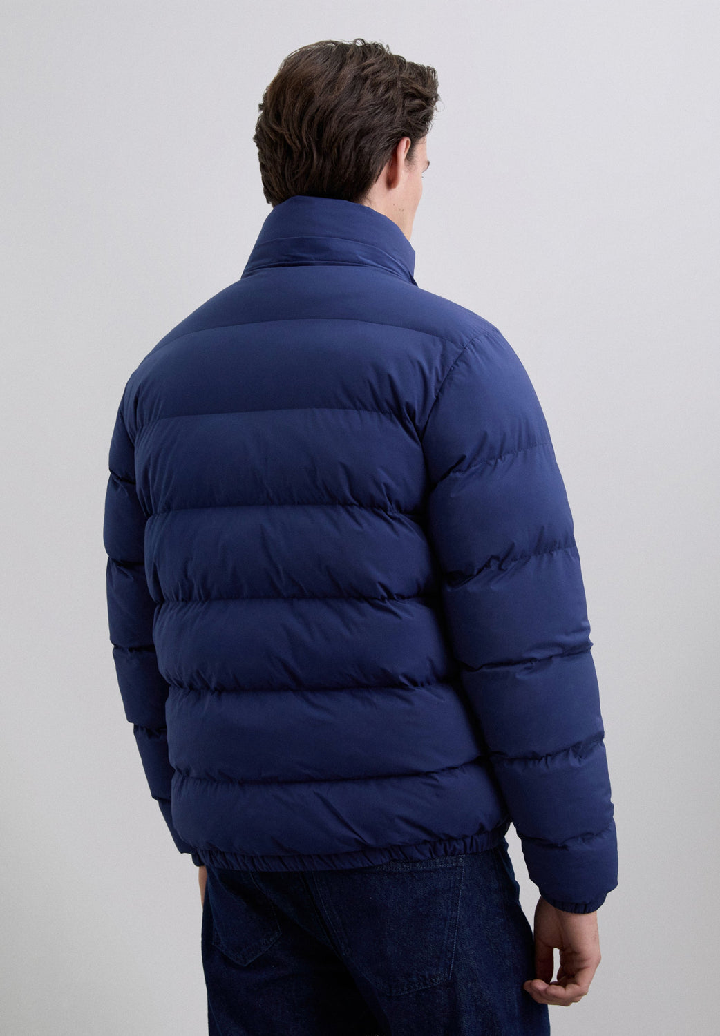 Padded jacket with skull detail on the arm. Two front pockets. Front zip fastening with customised pull. Customised aglets on the hood. Adjustable cuffs and hem. Thermolite filling. Detachable hood. Lining with diamond quilted detail.