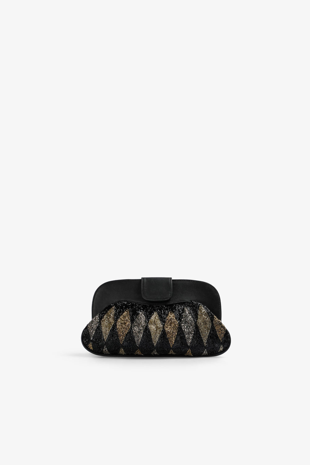 Handtas. Detail met kralen. Afneembare metalen band als schouderriem. Magneetsluiting. Geborduurd logo aan de binnenkant.