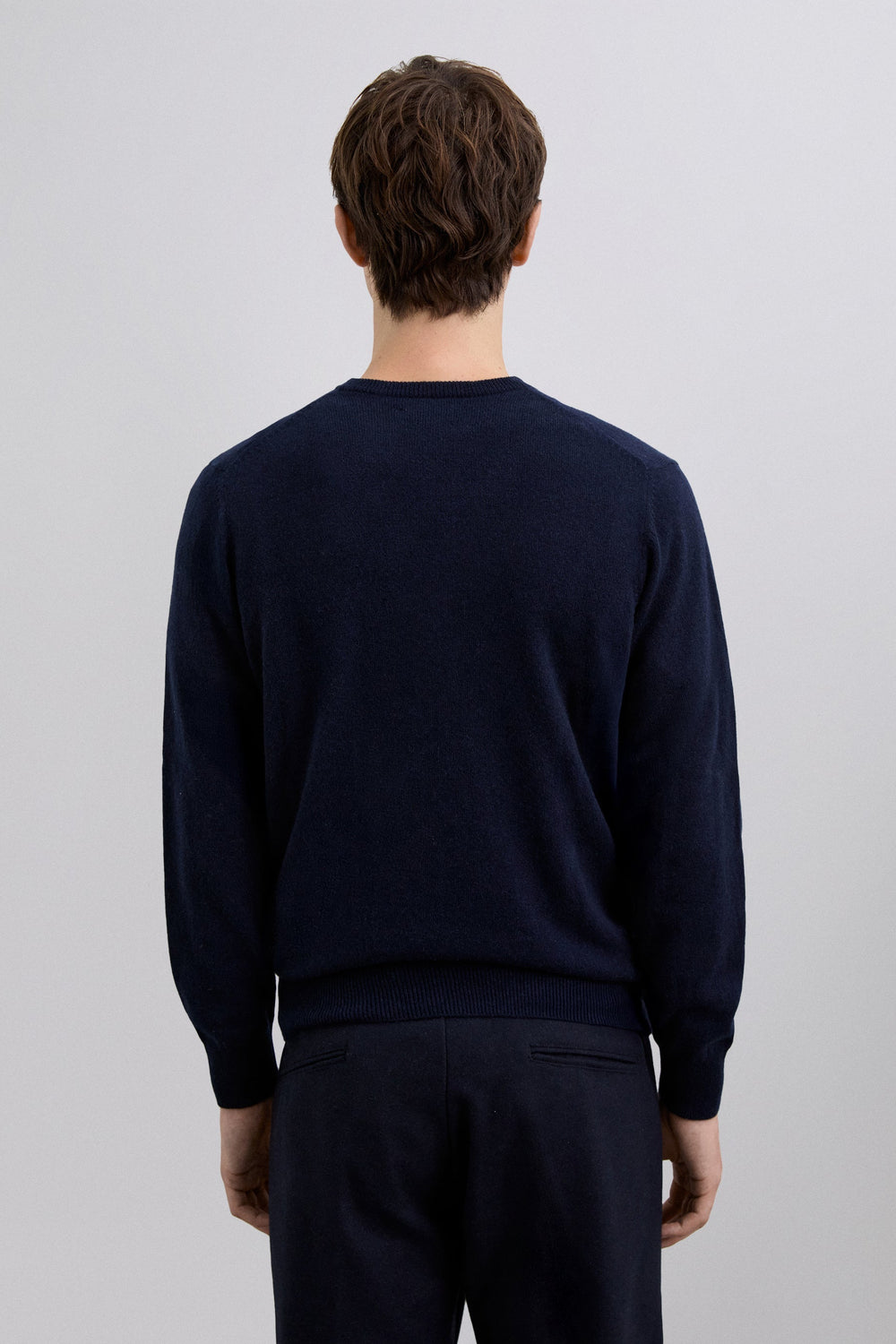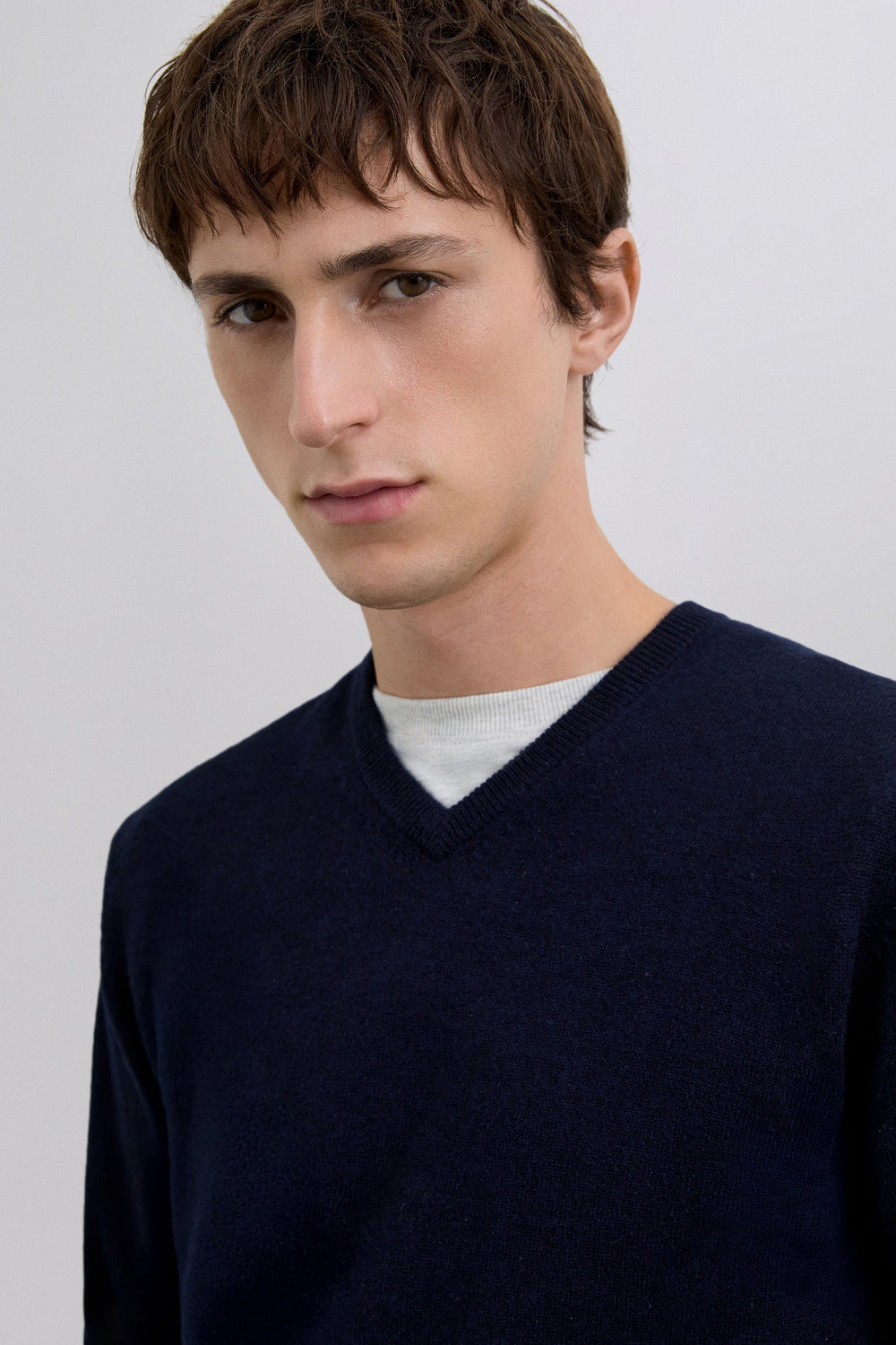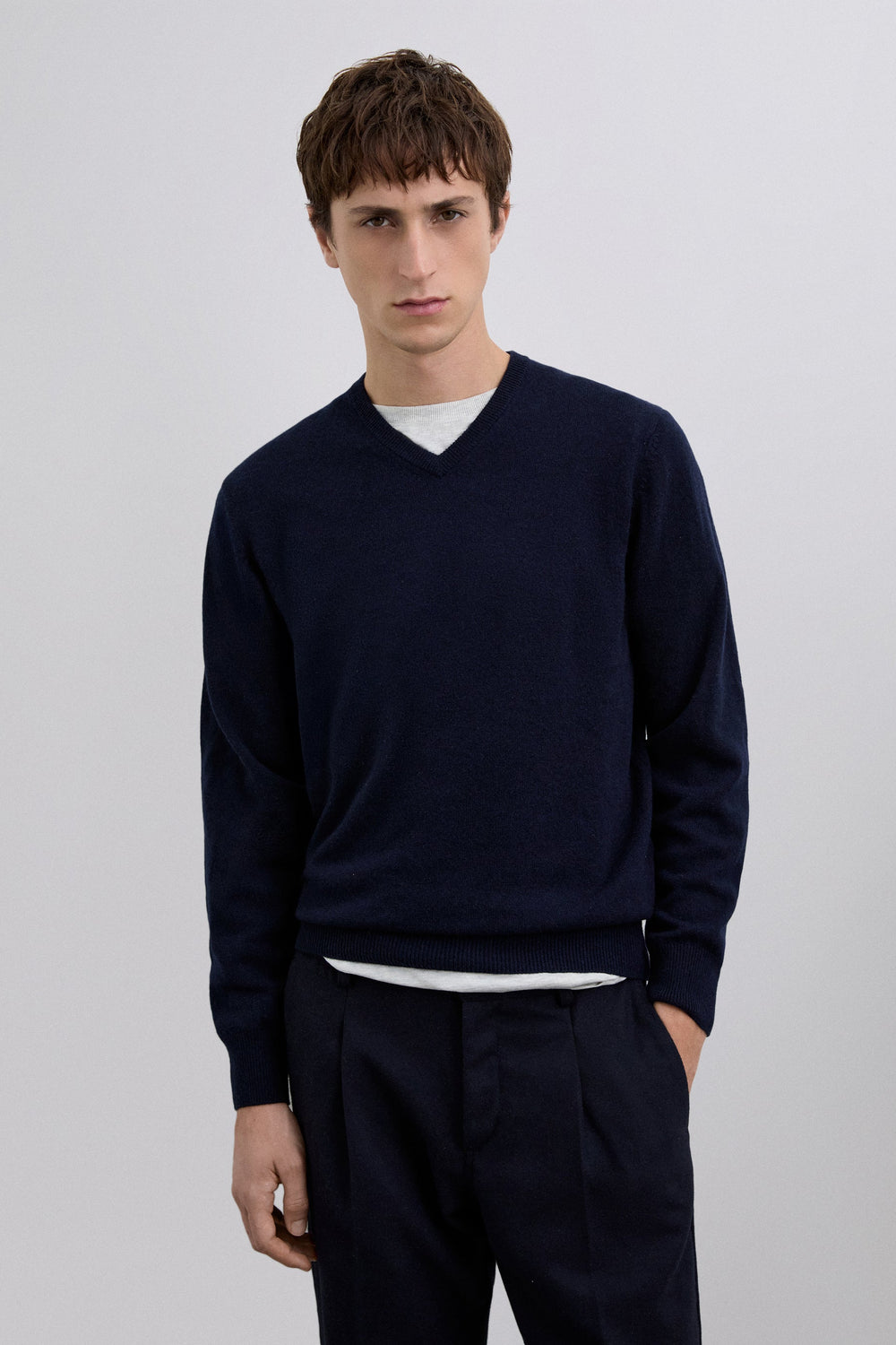 Jersey confeccionado en cachemira 100%. Corte Regular Fit. Cuello de pico. Manga larga.