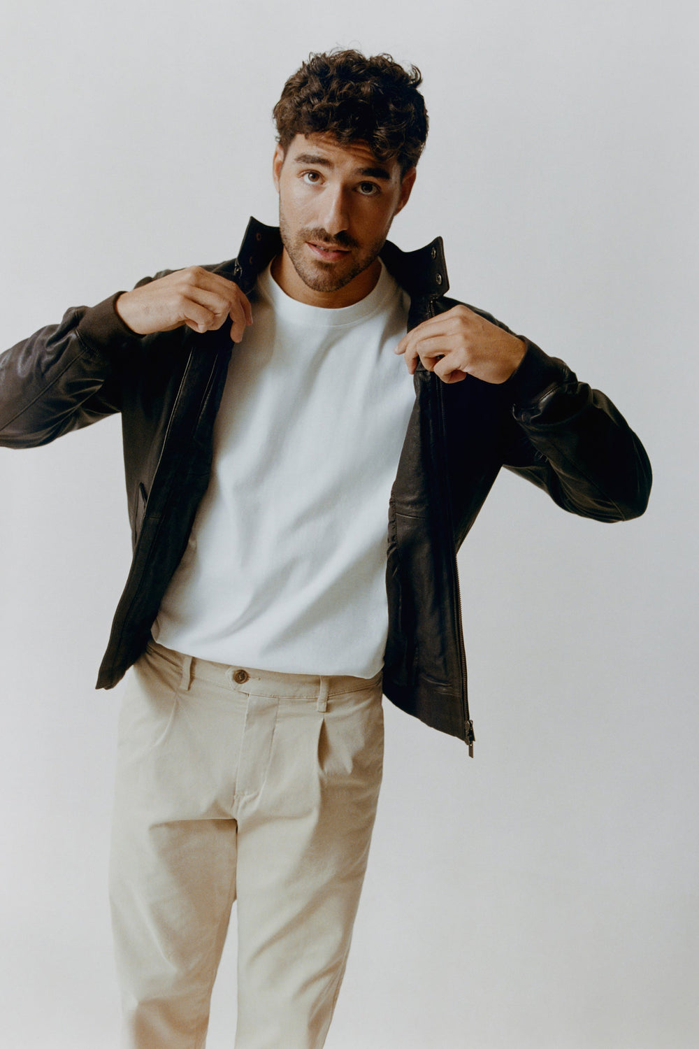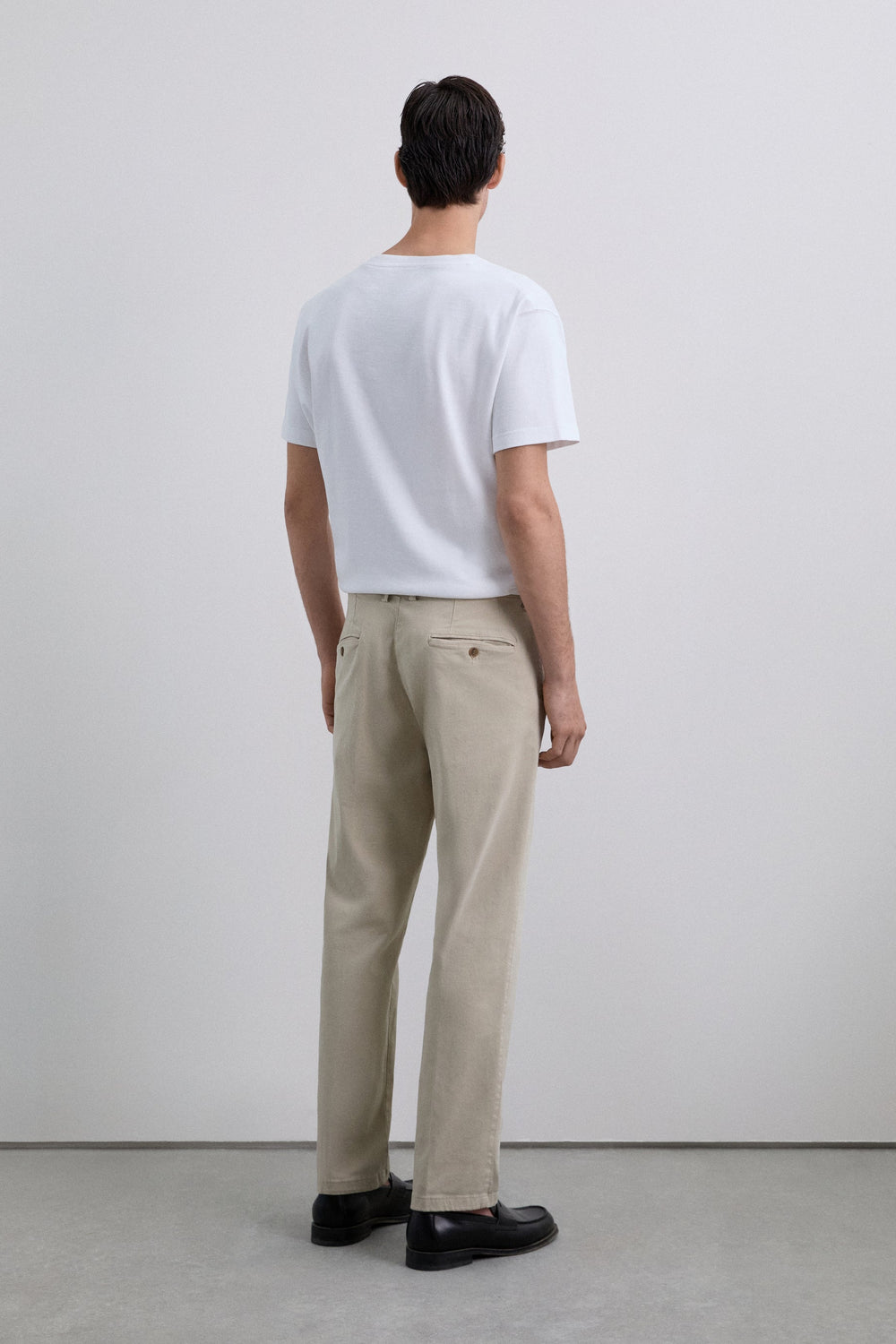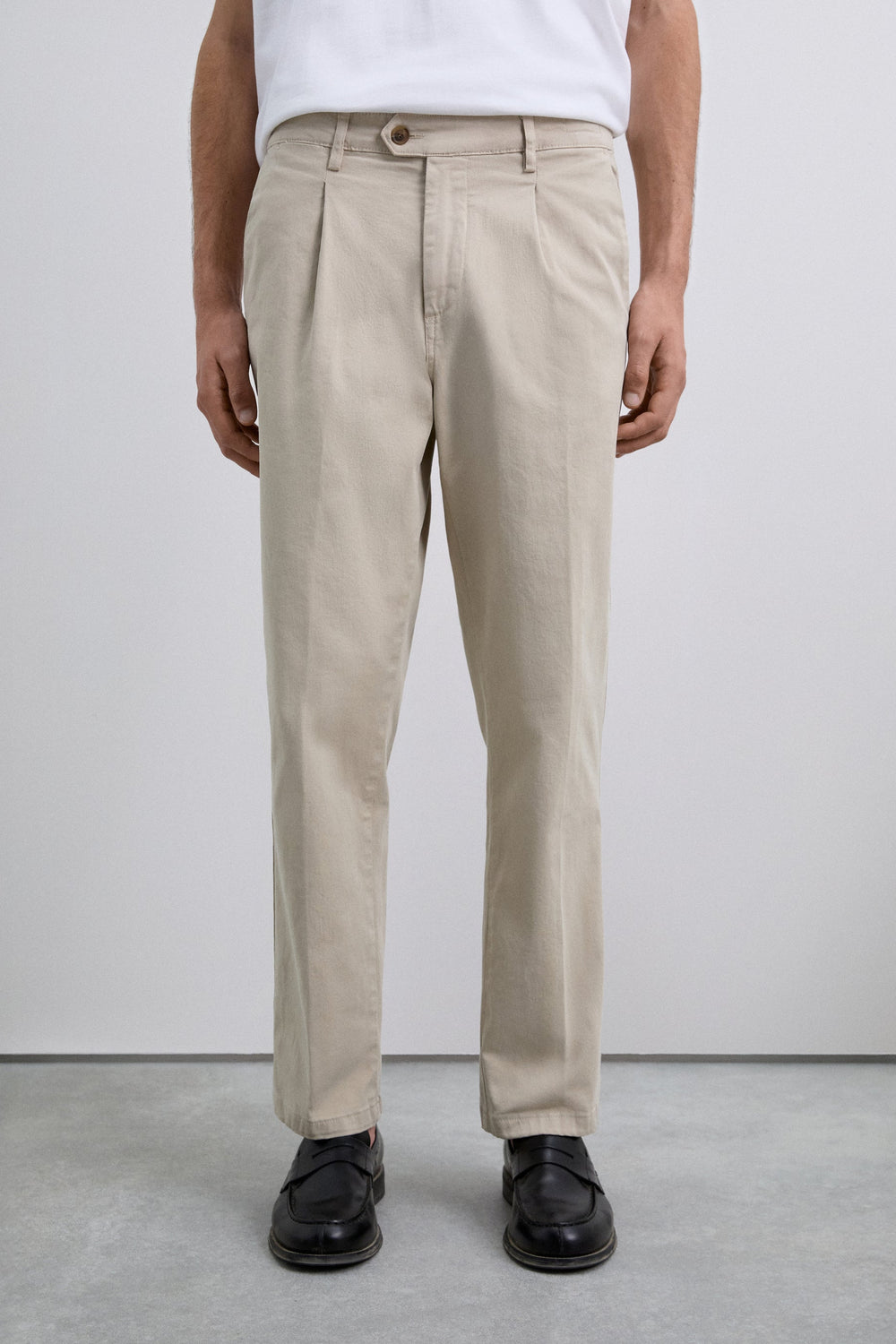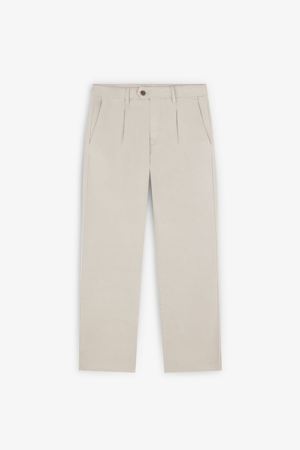 Chino gemaakt van katoen met lichte stretch. Los model met plooien. Blinde ritssluiting met knoopbies en knoop tot in de taille. Steekzakken en achterzakken. Riemlussen op de tailleband.