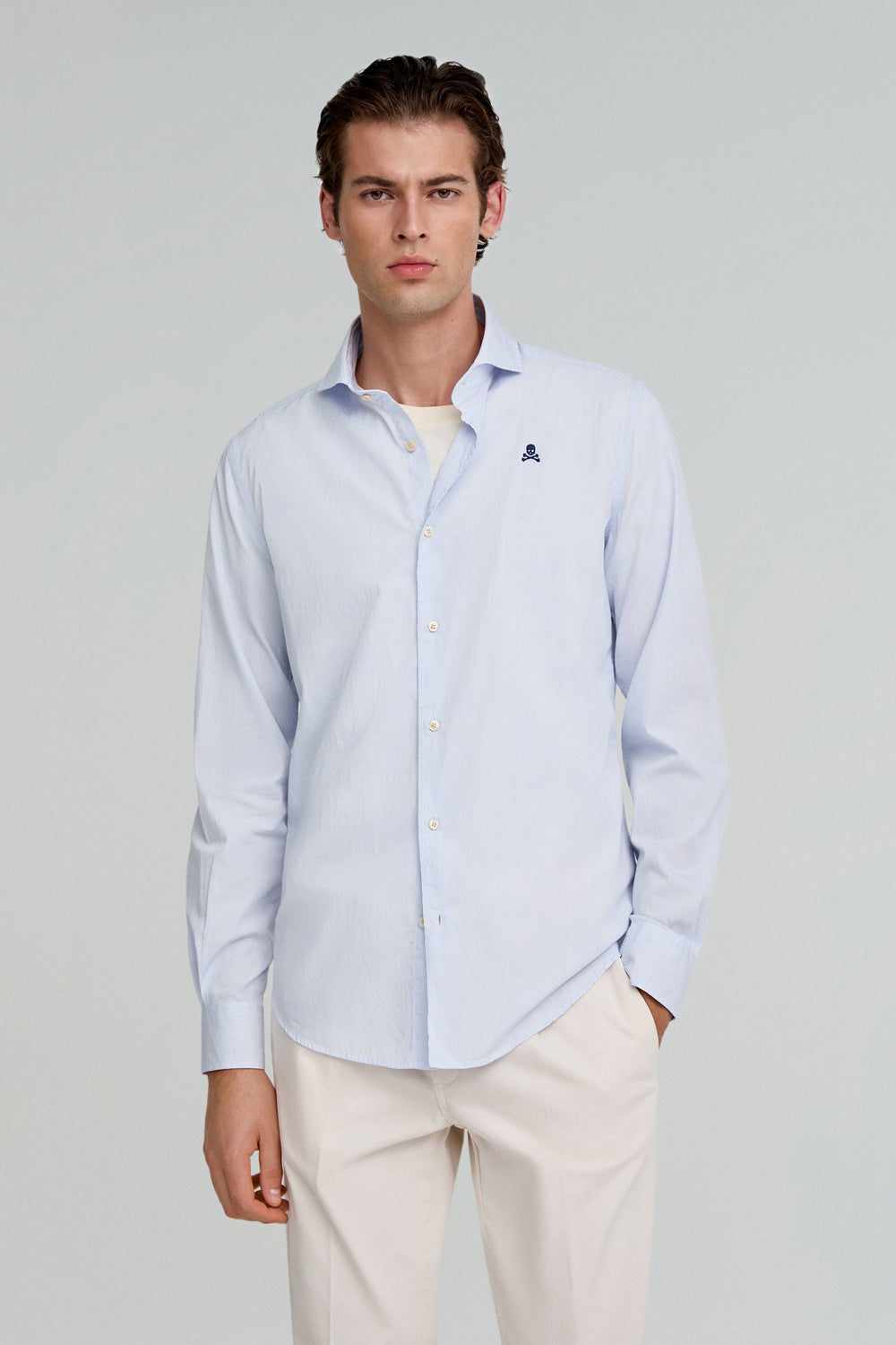 Camisa de vestir lisa. Confeccionada en tejido 100% algodón. Corte Regular Fit. Cuello cutaway. Cierre con botones. Manga larga terminada en puño simple. Detalle de calavera bordada en el pecho.