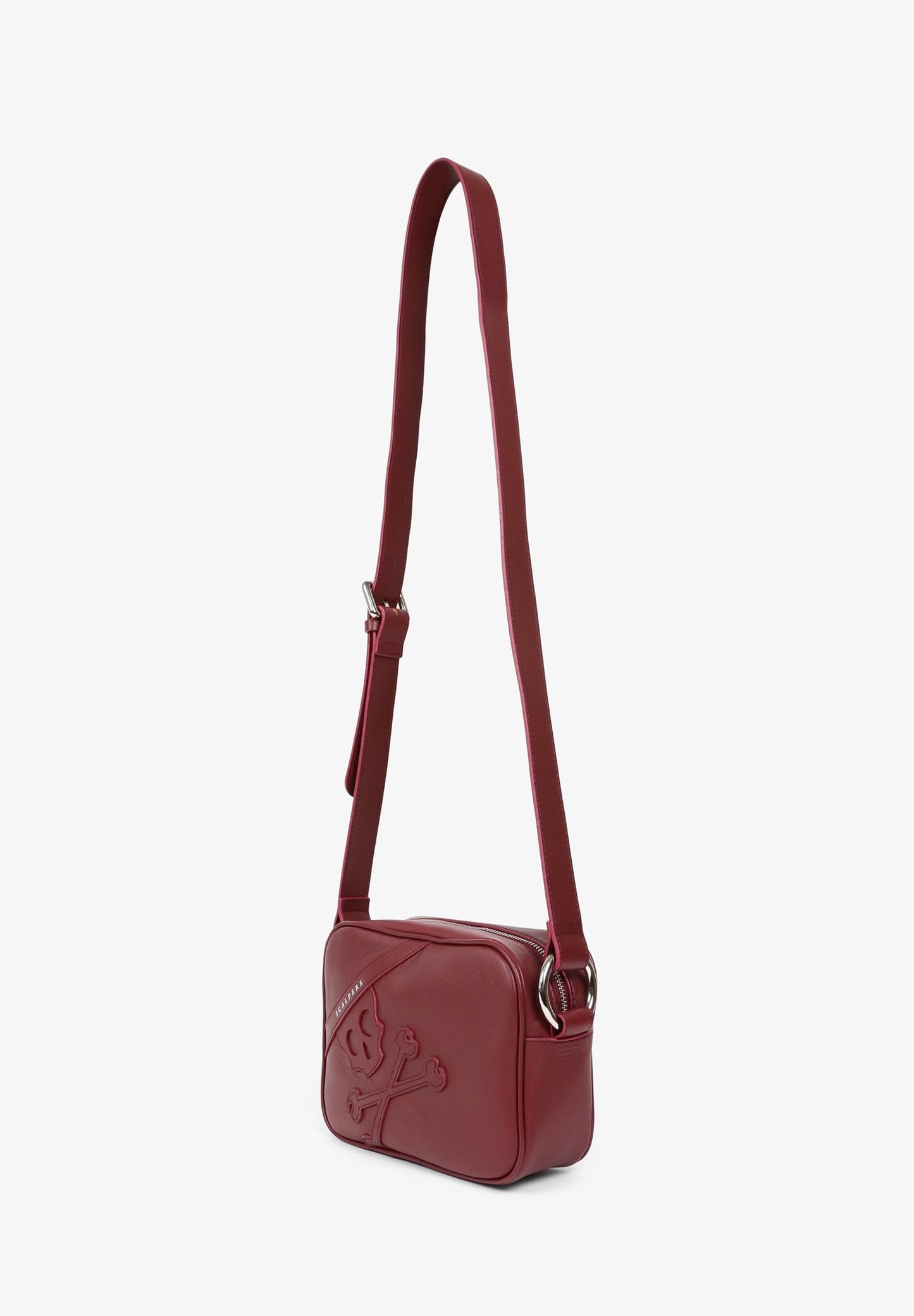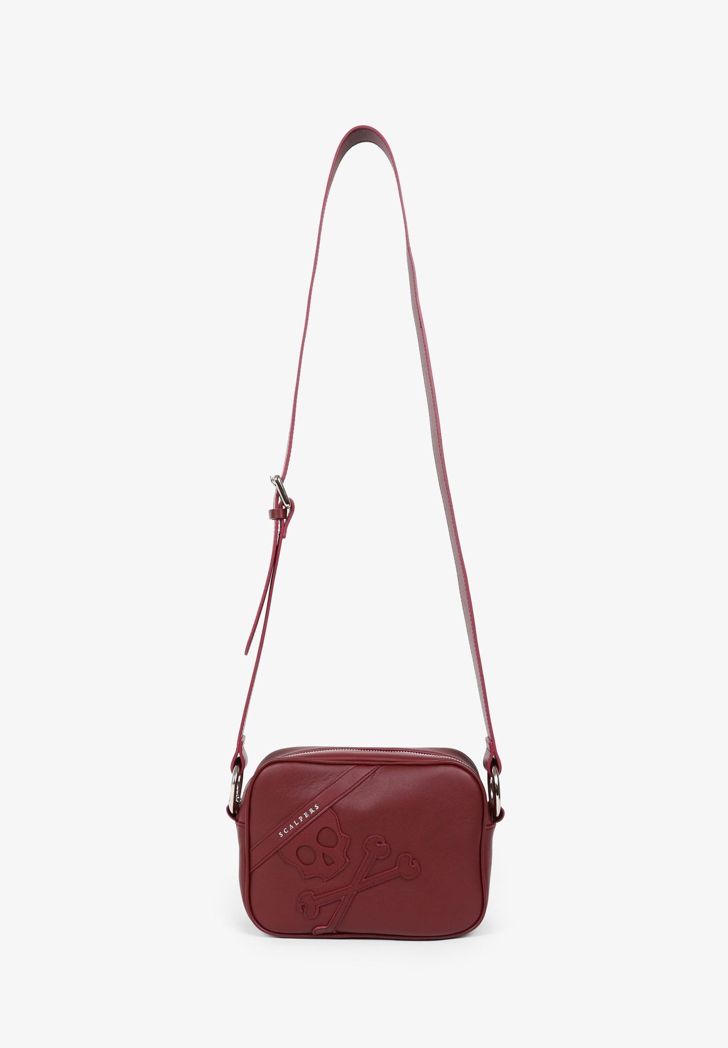 Leather maxi bag. Zip fastening, long adjustable strap with buckle and metal rings.