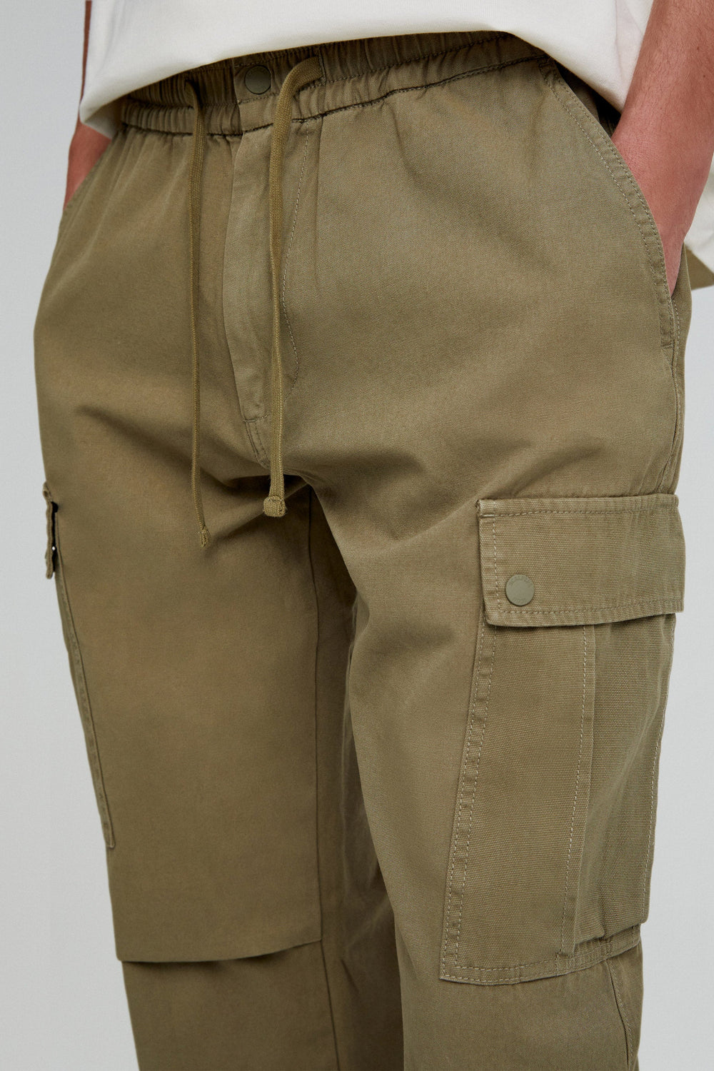 Cargo trousers made of 100% BCI cotton. Regular fit, elastic waist with drawstring. Side pockets and leg pocket. Seam detail on the leg.
